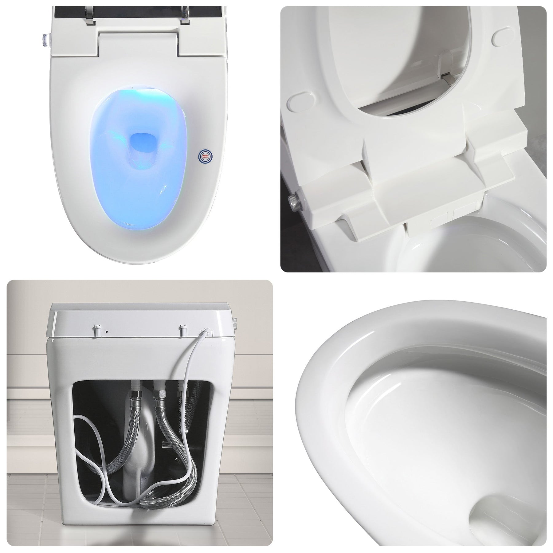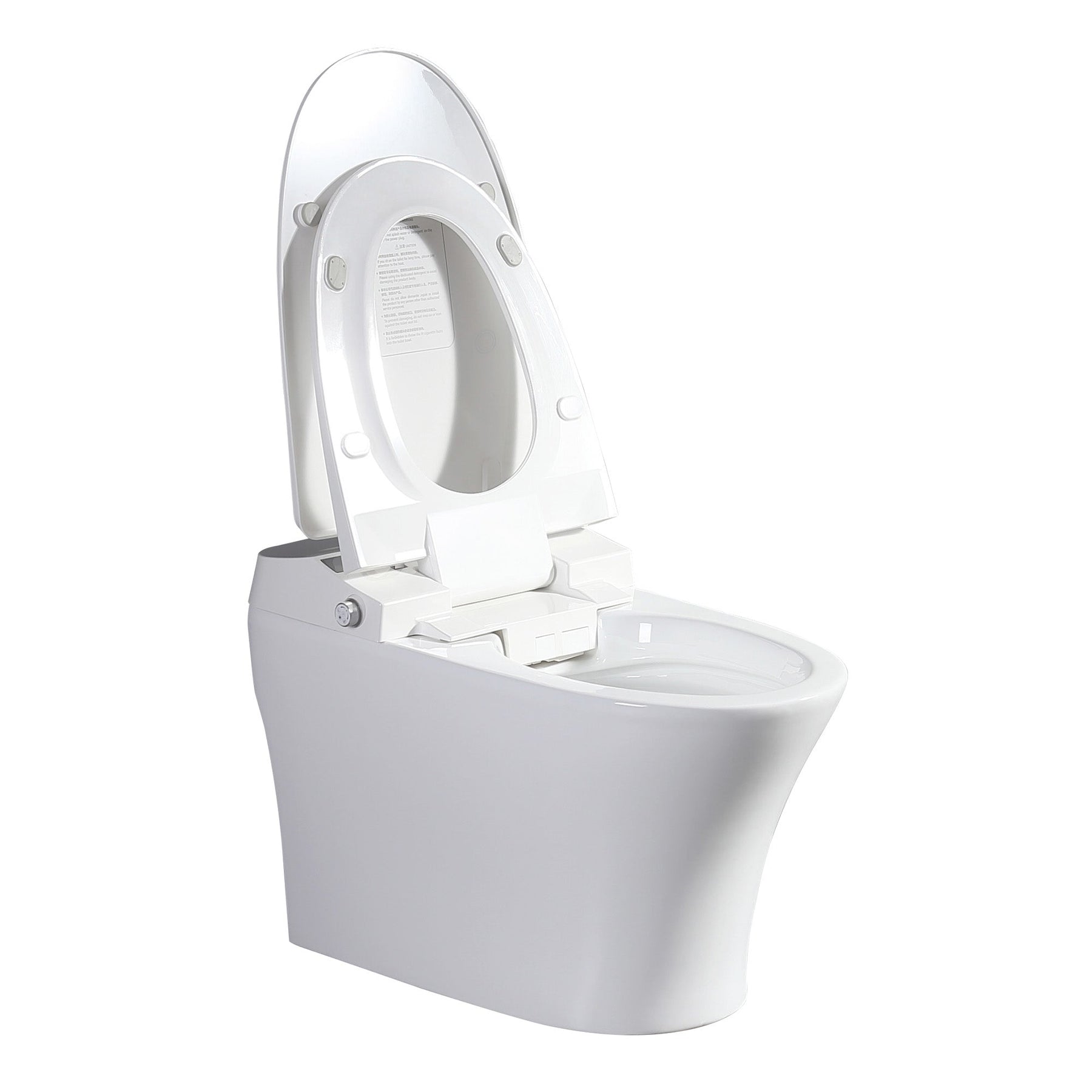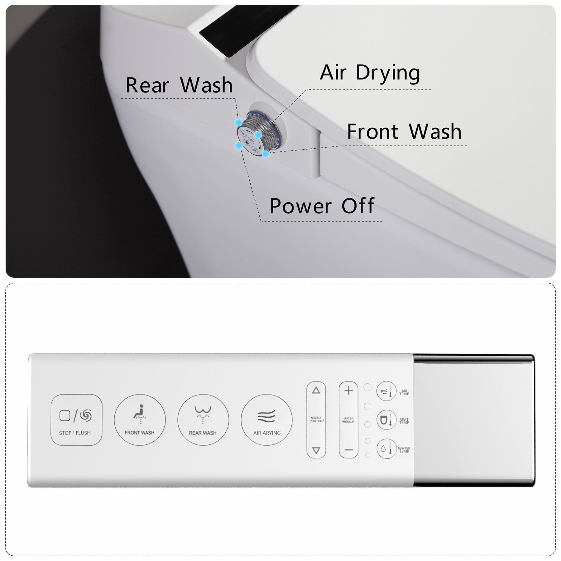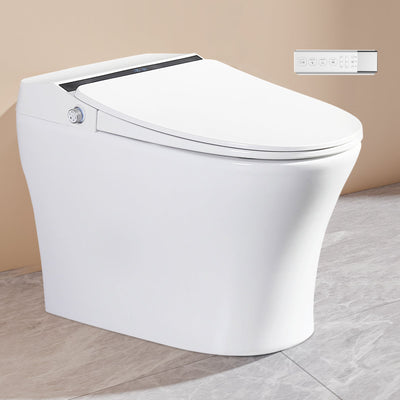 A modern 1-piece smart toilet that blends sleek style with advanced hygiene and comfort. Features an elongated bowl, auto flush, heated seat, front/rear wash, air drying, and an intuitive remote with LED display.