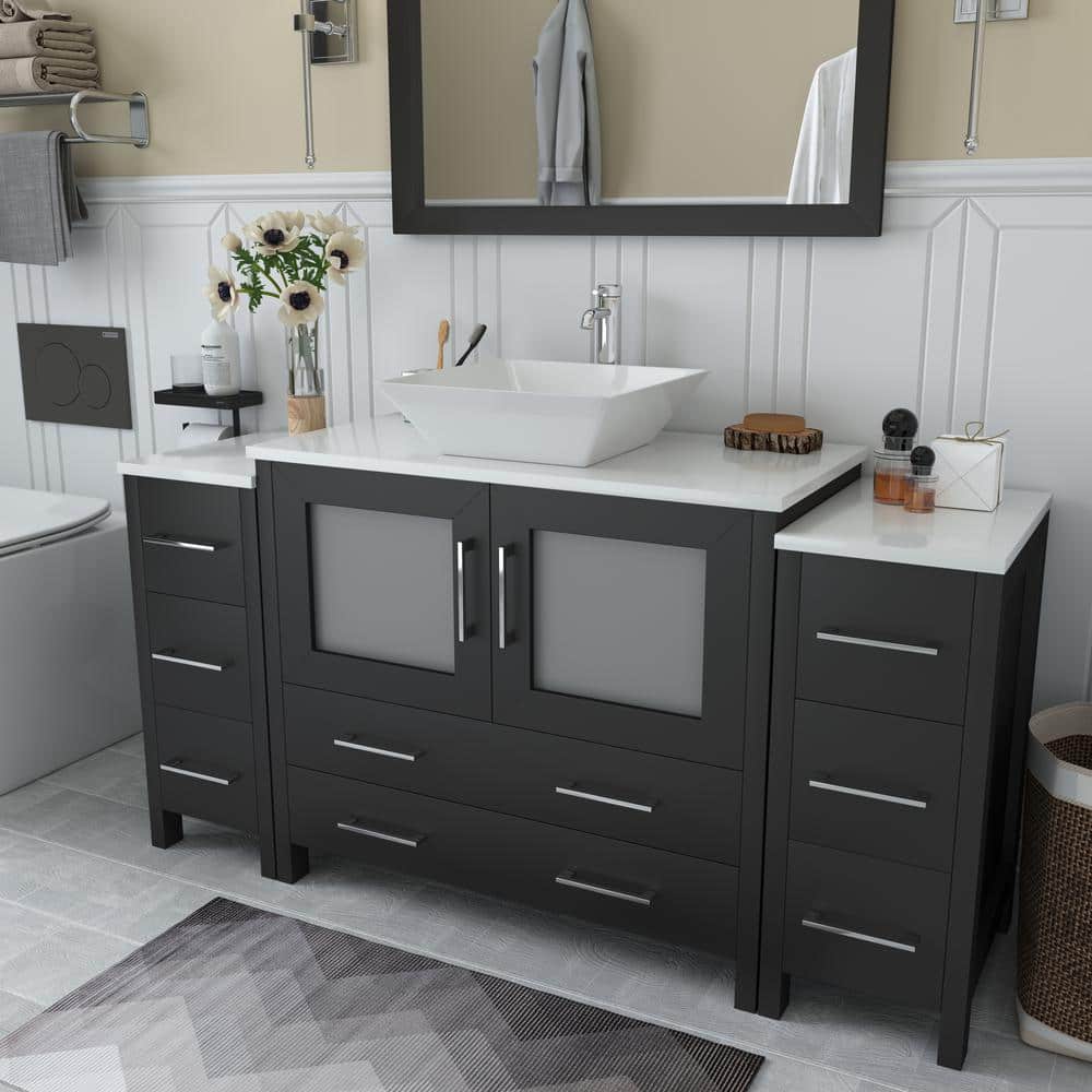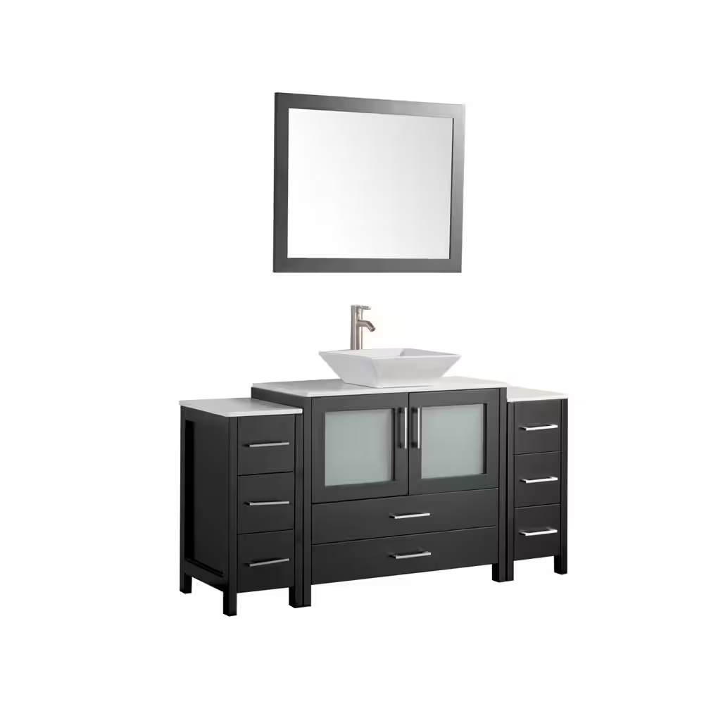 The Vanity Art Ravenna 60-inch Bathroom Vanity in Espresso is a sophisticated mix of luxury and contemporary design, ideal for homeowners looking to upgrade their bathroom aesthetics. The vanity is finished in espresso and topped with a durable white engineered marble, accompanied by a matching mirror. It balances elegance with ample functionality.