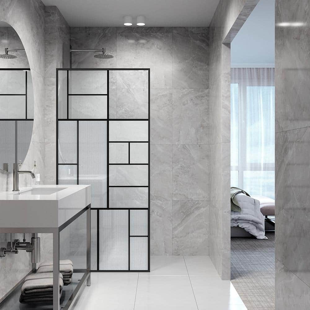 Mondrian Design: Elegant grid pattern in matte black with clear and privacy glass options.