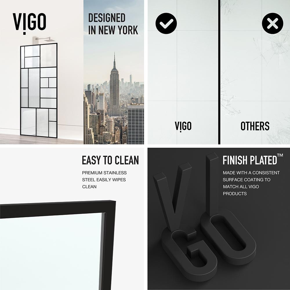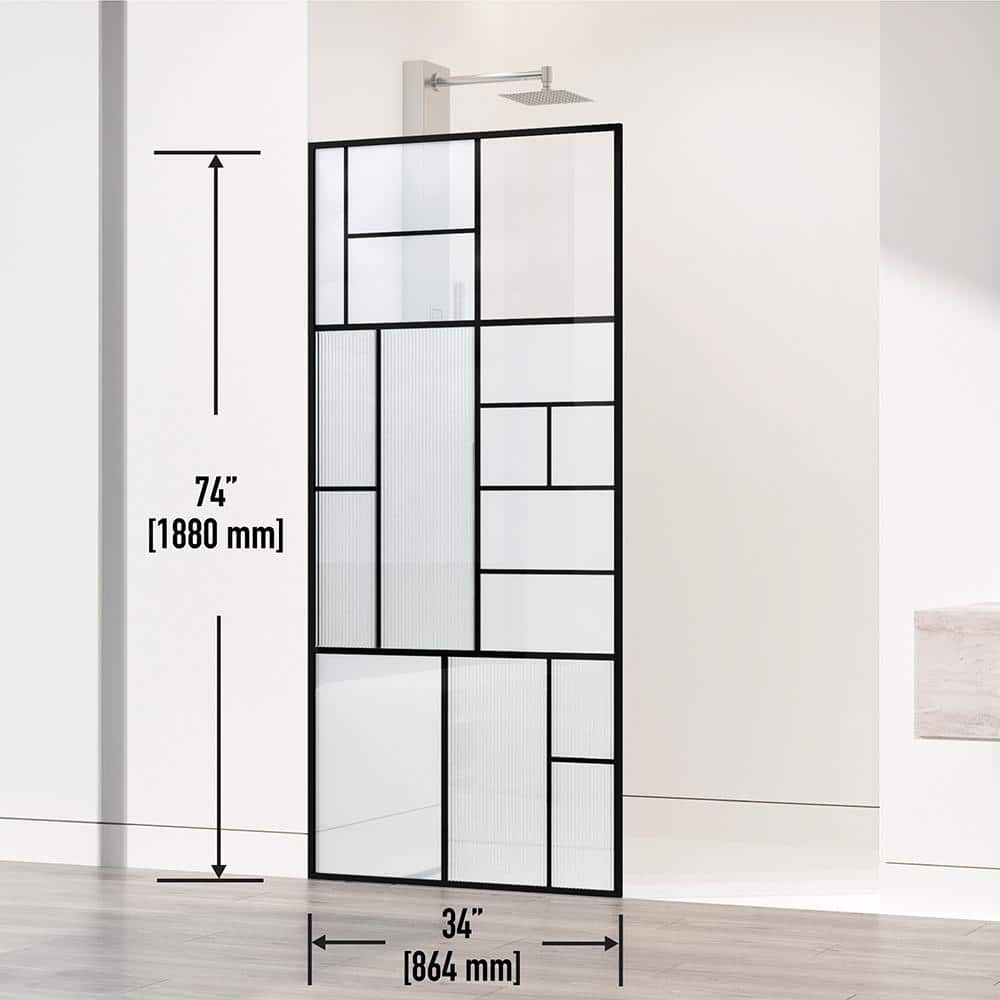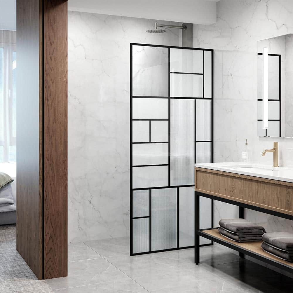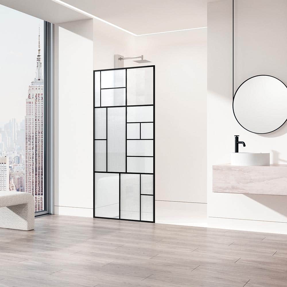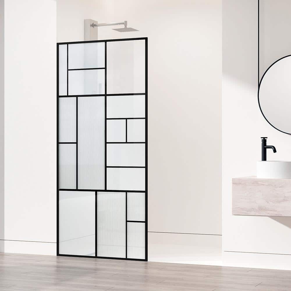 Transform your bathroom with the VIGO Meridian Framed Shower Screen, featuring a captivating Mondrian-style design. This elegant matte black framed screen combines clear grid, privacy options, and Fluto white glass for a modern, versatile bathing experience. With its sleek frame and waterproof seal, this shower screen ensures both aesthetic appeal and practical function.