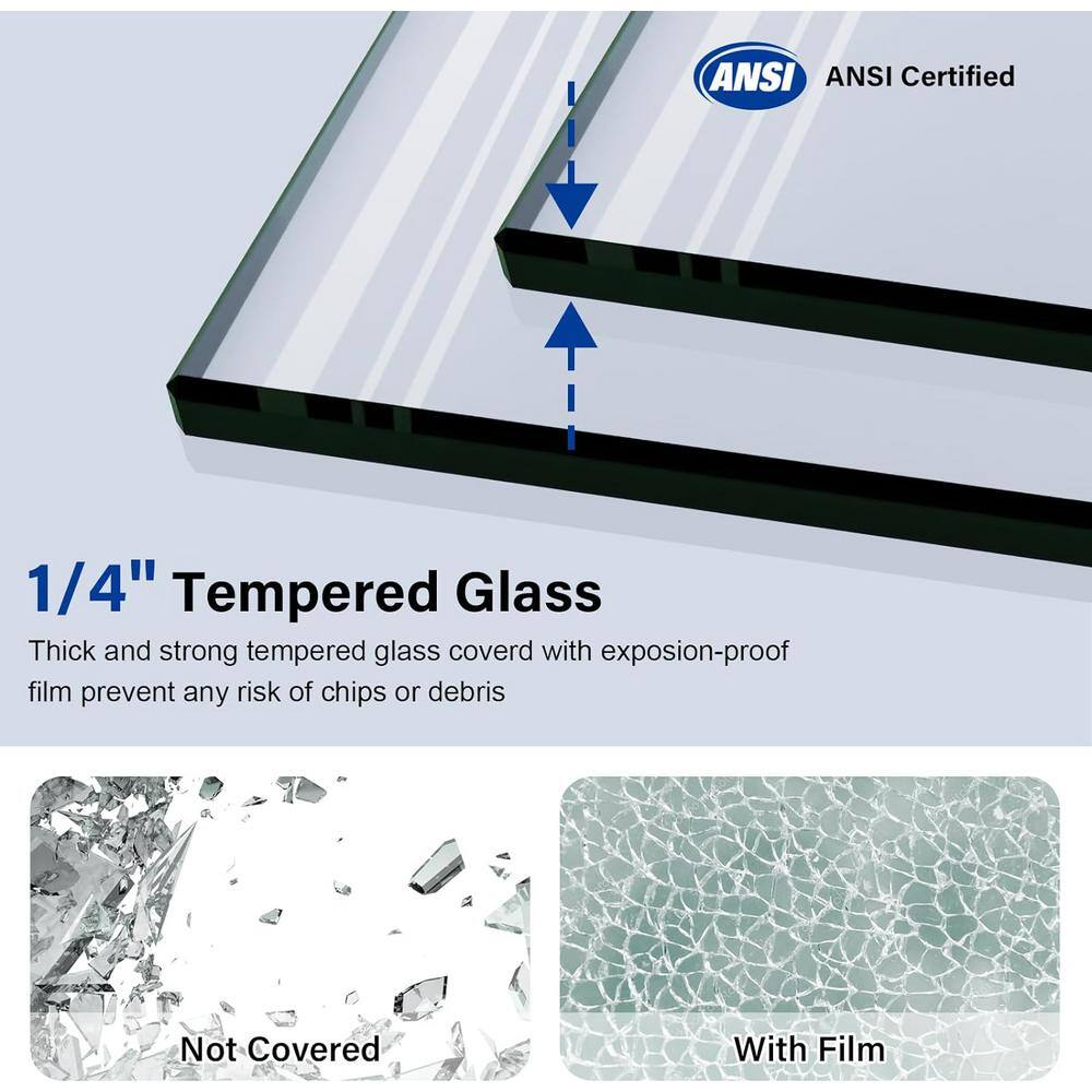 Tempered Glass: 1/4 inch thick, SGCC and ANSI certified for safety and strength.