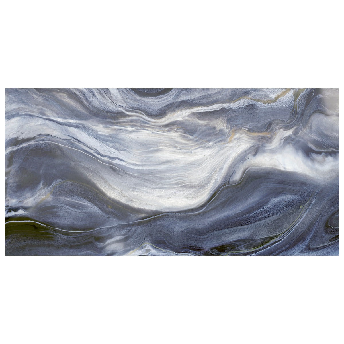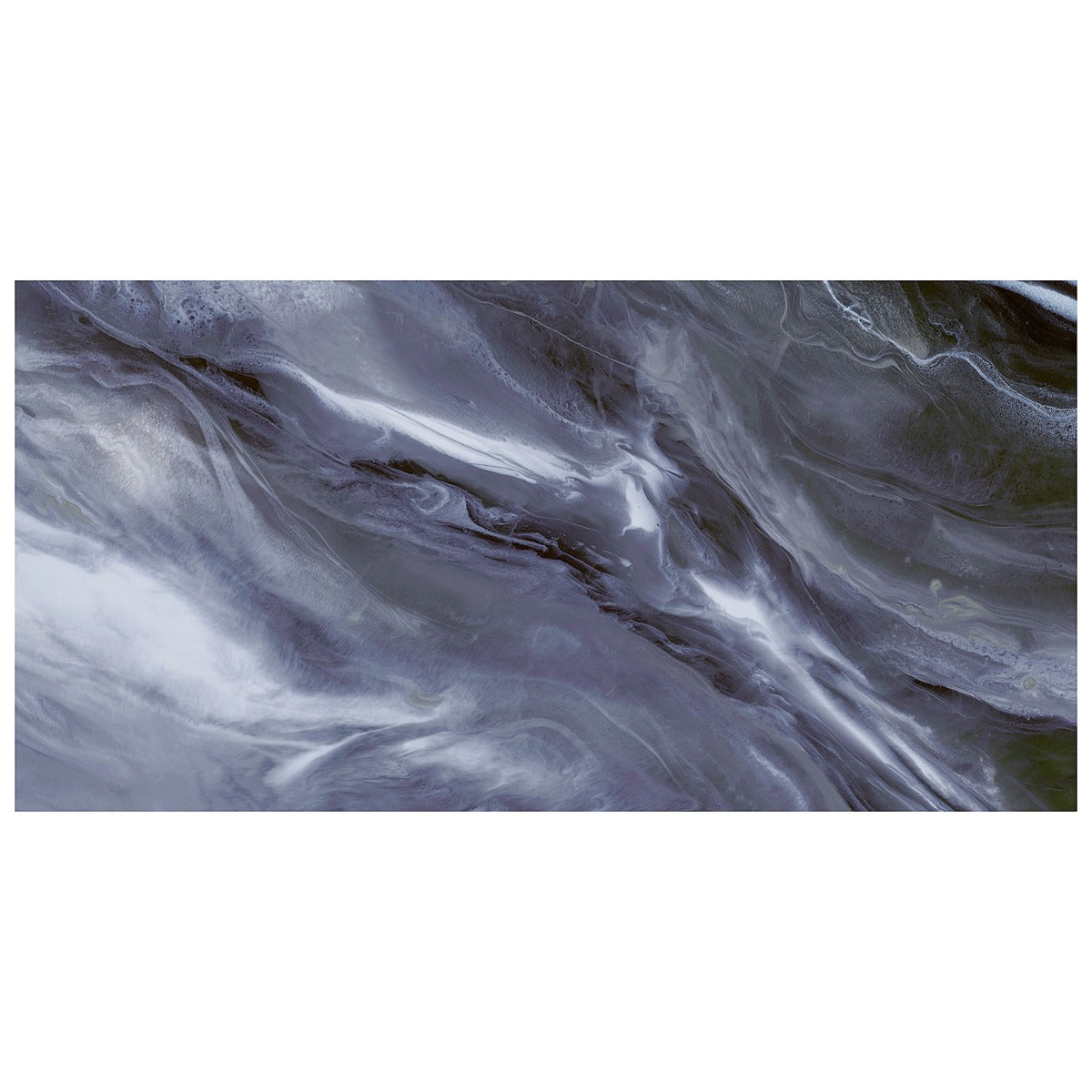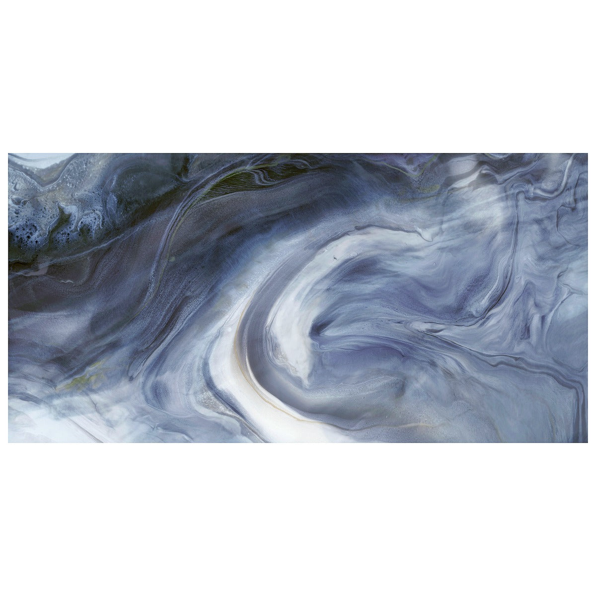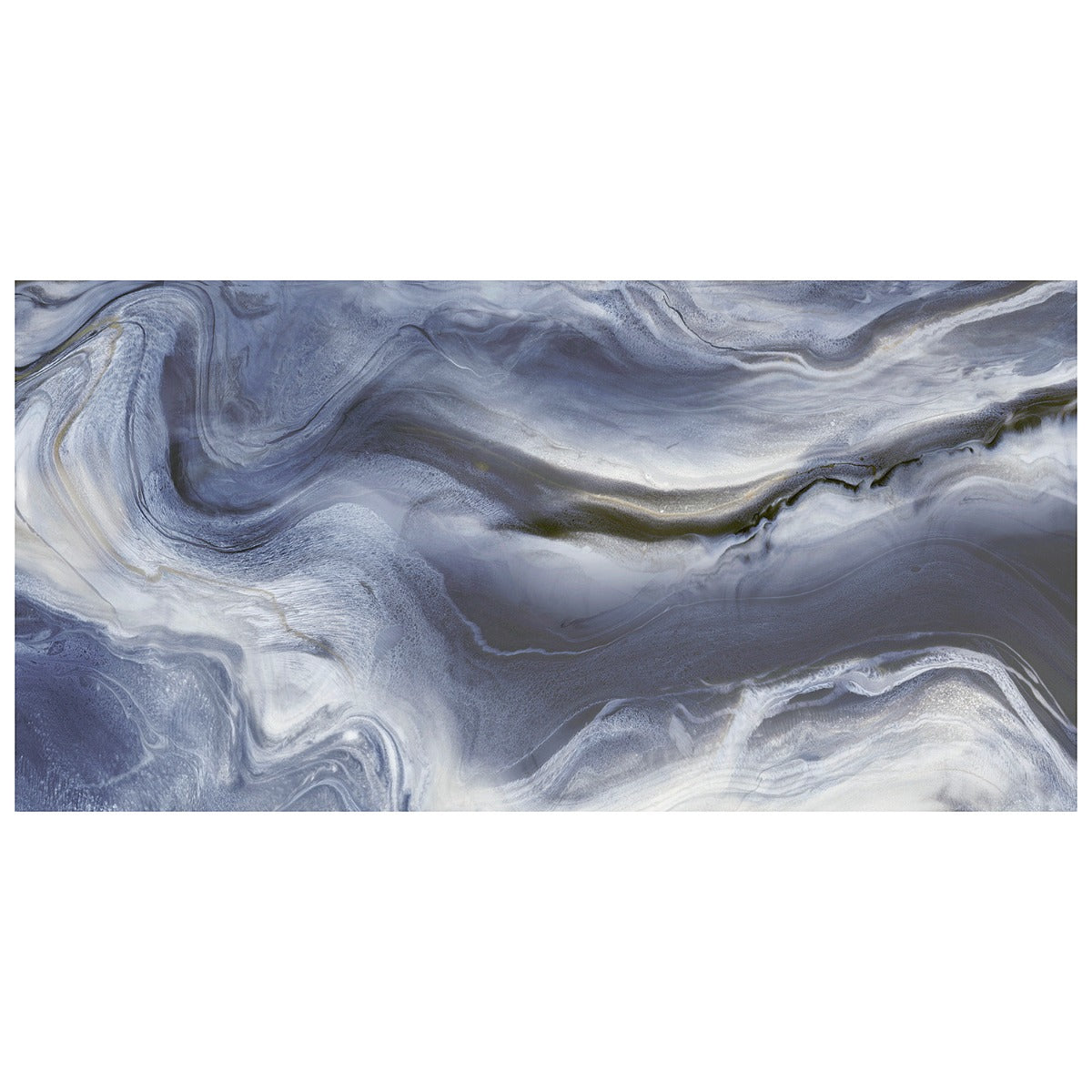 The Waverly Blue Polished Porcelain Tile features a stunning marble-like design with fluid swirls of white and dark gray on a bluish-gray background. Its polished finish and rectified edges make it perfect for creating a seamless, luxurious look in any space.