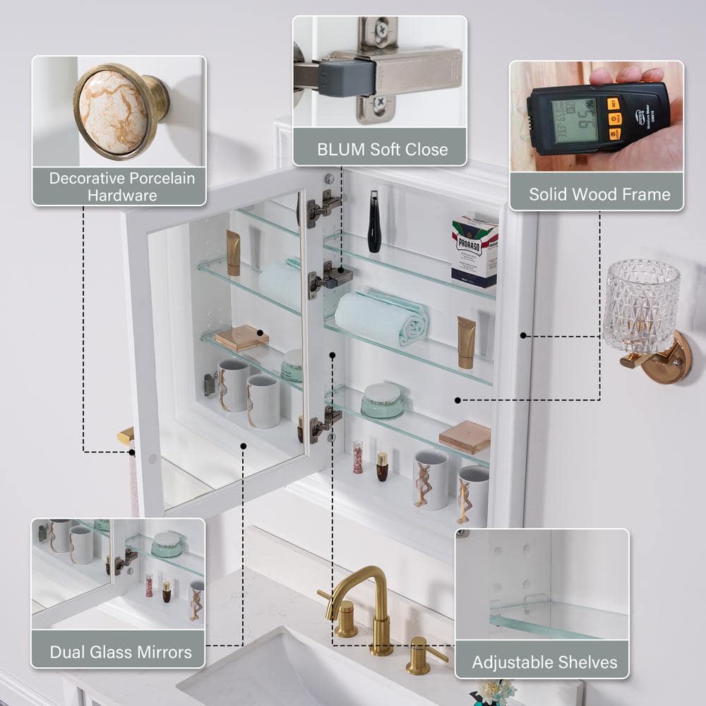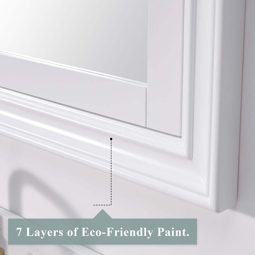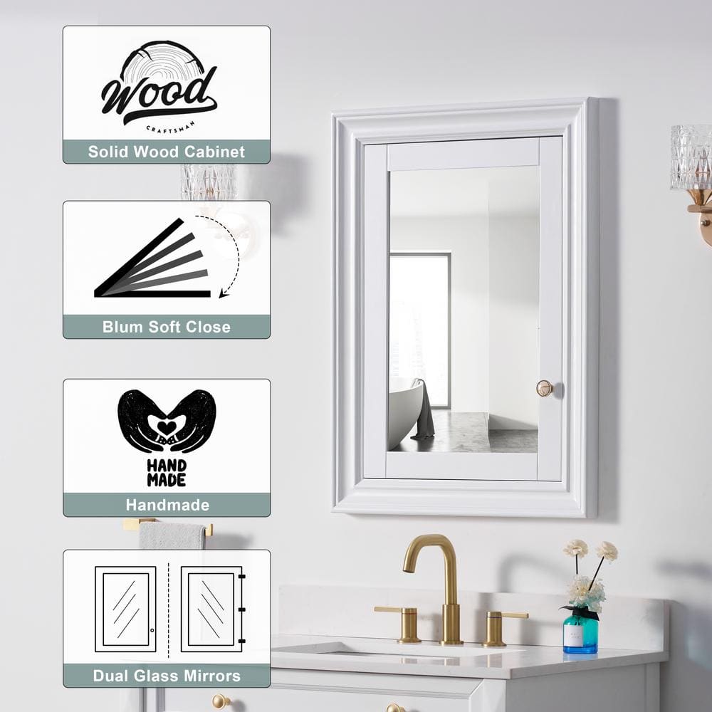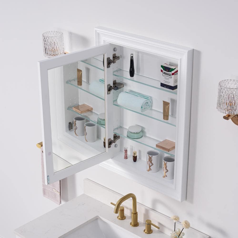 Enhance your bathroom with the WELLFOR Solid Wood Recessed Medicine Cabinet featuring a dual mirror design and soft-close doors. Constructed from durable rubber wood, this elegant and functional cabinet seamlessly integrates into your wall, maximizing your space while offering organized storage with adjustable glass shelves.