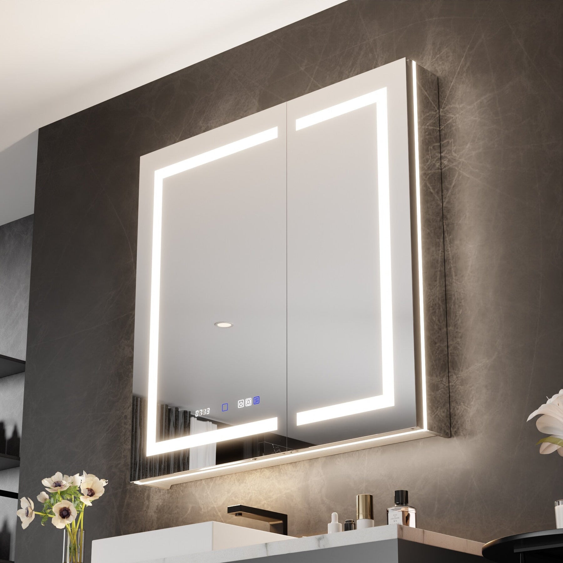 A: Yes, the cabinet features a built-in defogging function that keeps mirrors clear, shutting off automatically after 60 minutes for energy savings.