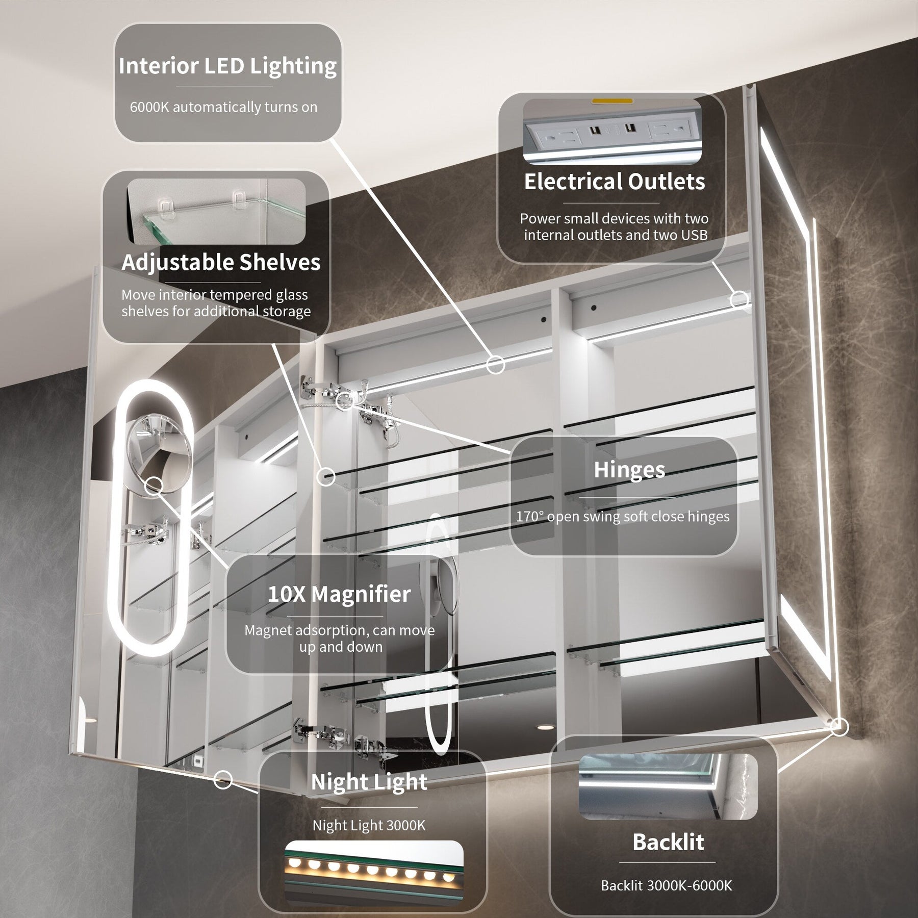 A: Yes, the cabinet offers stepless adjustment between 3000K and 6000K for a customizable lighting experience.