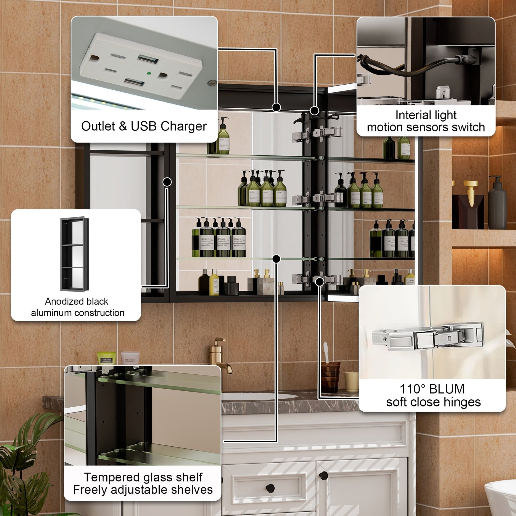 Q: What safety features does the cabinet include? A: The cabinet includes motion sensor-activated lights and an anti-fog pad with automatic shut-off after 60 minutes to enhance safety and energy efficiency.