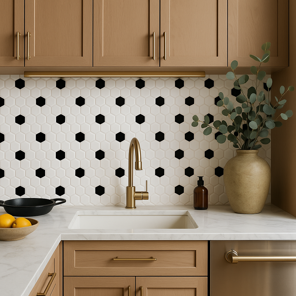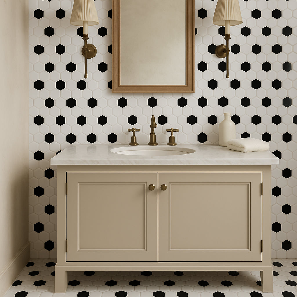 Transform your space with the elegant and versatile White and Black Hexagon Polished Porcelain Mosaic—order now to elevate your design!