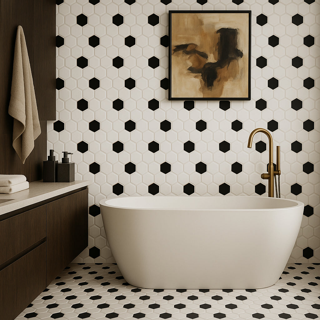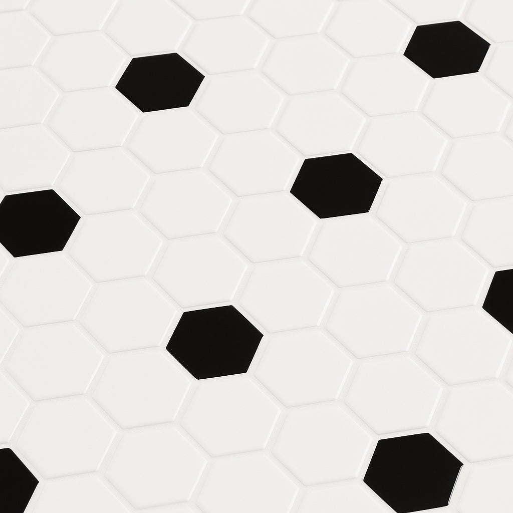 The White and Black Hexagon Polished Porcelain Mosaic is a stylish and durable tile option for both indoor and outdoor spaces. Featuring a high gloss finish and water-resistant properties, it is perfect for bathrooms, kitchens, and even pool interiors.