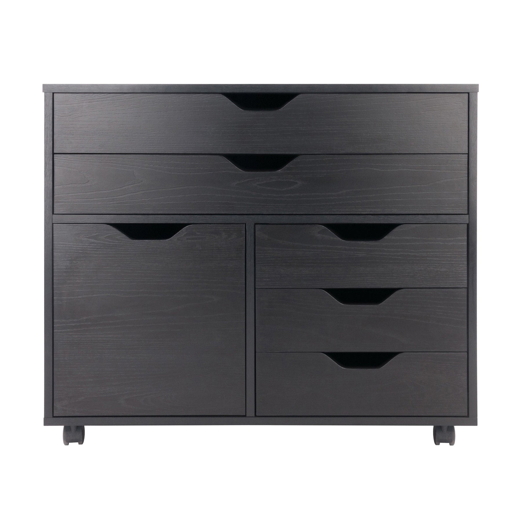 Streamline your workspace and enhance organization with the Winsome Halifax Black 5-Drawer Mobile File Cabinet. Expertly crafted from durable composite wood, this versatile storage unit features a sleek black finish, making it a stylish addition to any environment. Effortlessly mobile with five smooth-rolling wheels, it’s designed for optimal utility in both professional and residential spaces.
