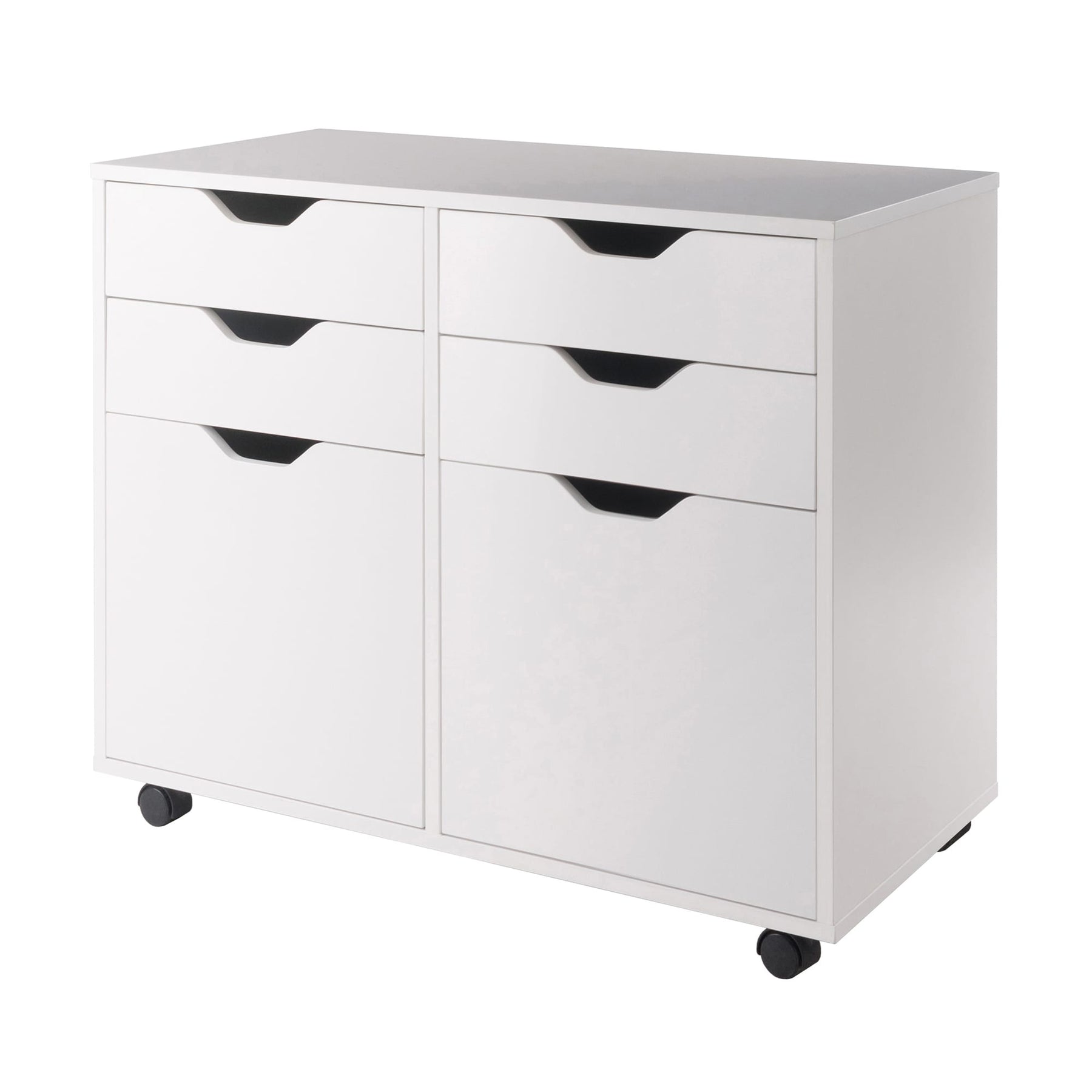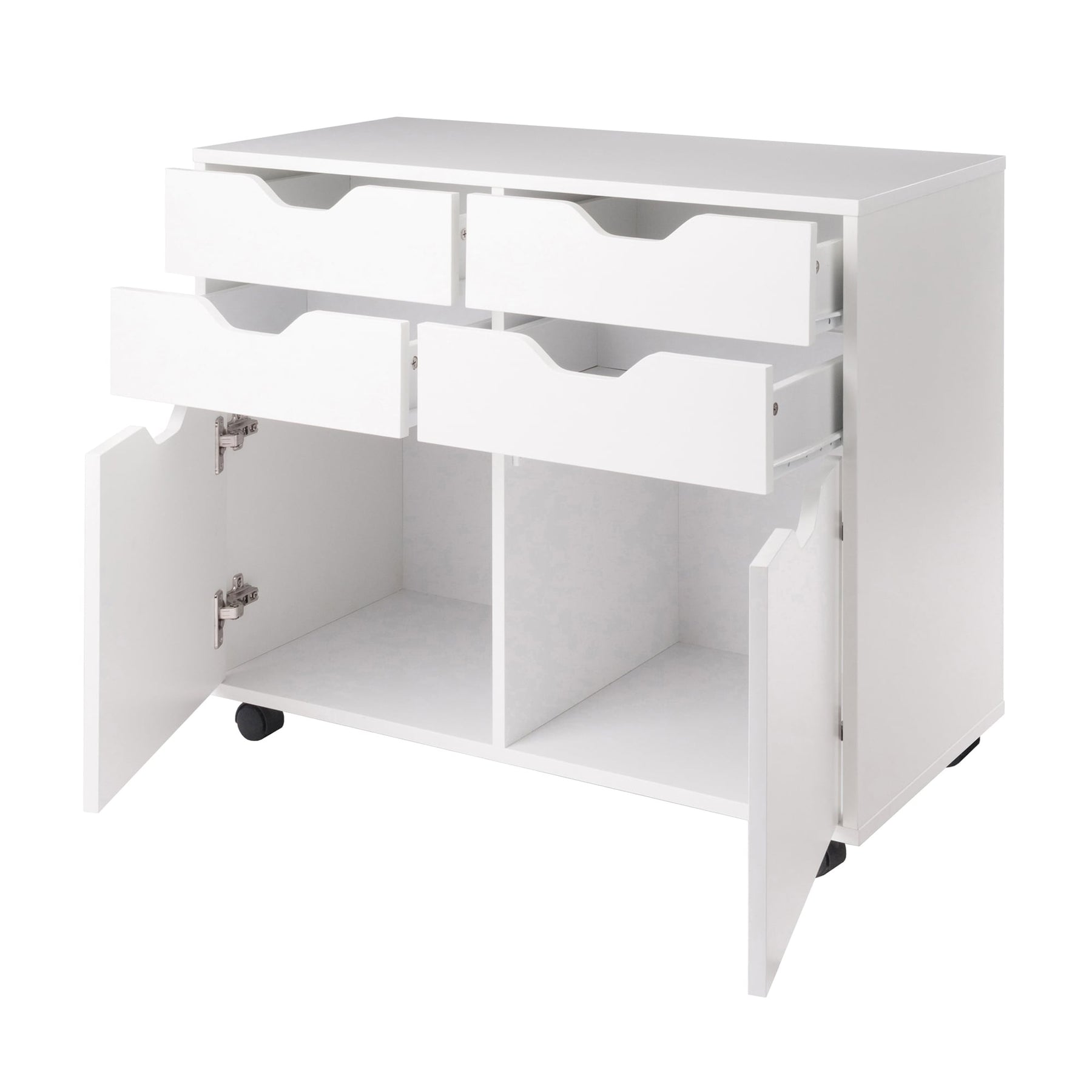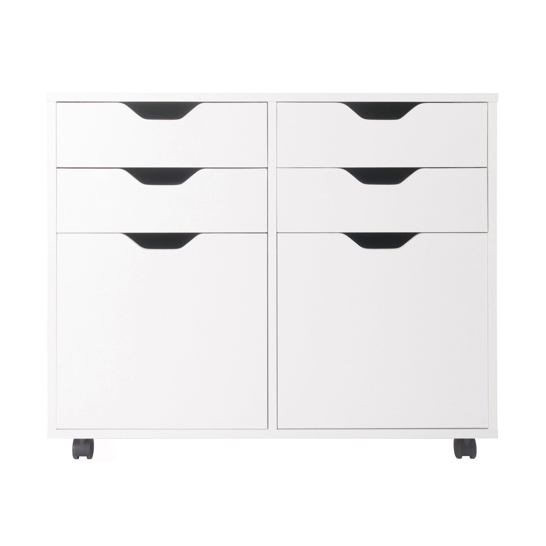 The Winsome Wood Halifax White 4-Drawer File Cabinet maximizes your organization with style. This versatile mobile cabinet includes four easy-glide drawers and bottom cabinet storage, making it perfect for home offices, bedrooms, or garages. Its sleek composite wood finish in classic white seamlessly integrates into any decor while providing convenient storage solutions.