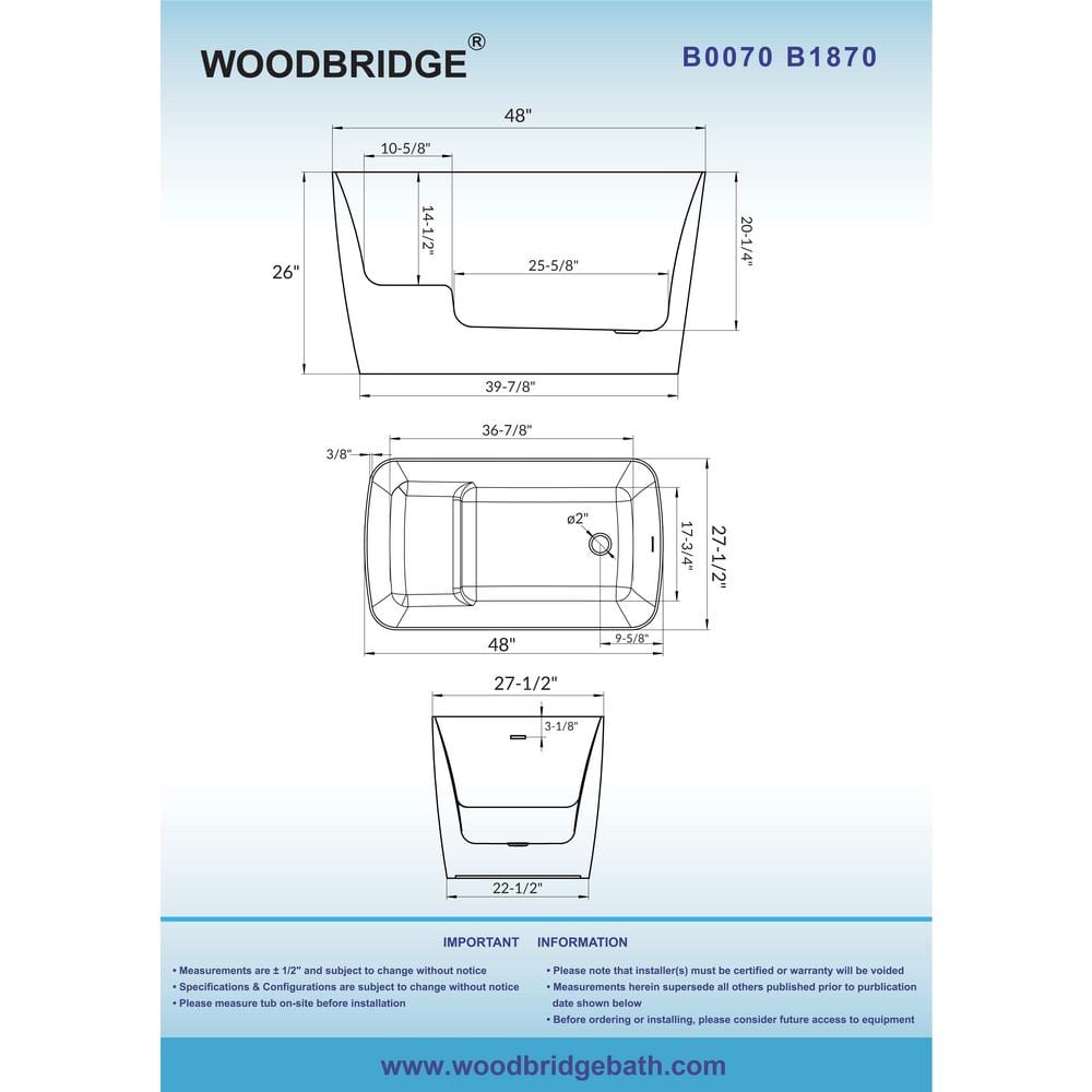Q: What are the overall dimensions? A: 48 in. L x 27.5 in. W x 26 in. H; soaking depth about 22-7/8 in.