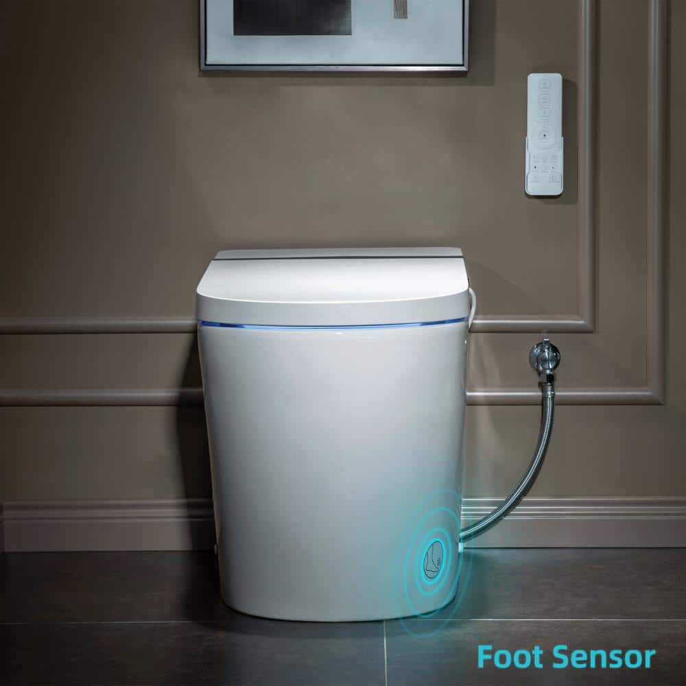 Q: How does the automatic flushing feature work? A: The automatic flushing feature activates the self-cleaning bidet spray wand and follows with a powerful flush once you leave the seat, ensuring hands-free operation.