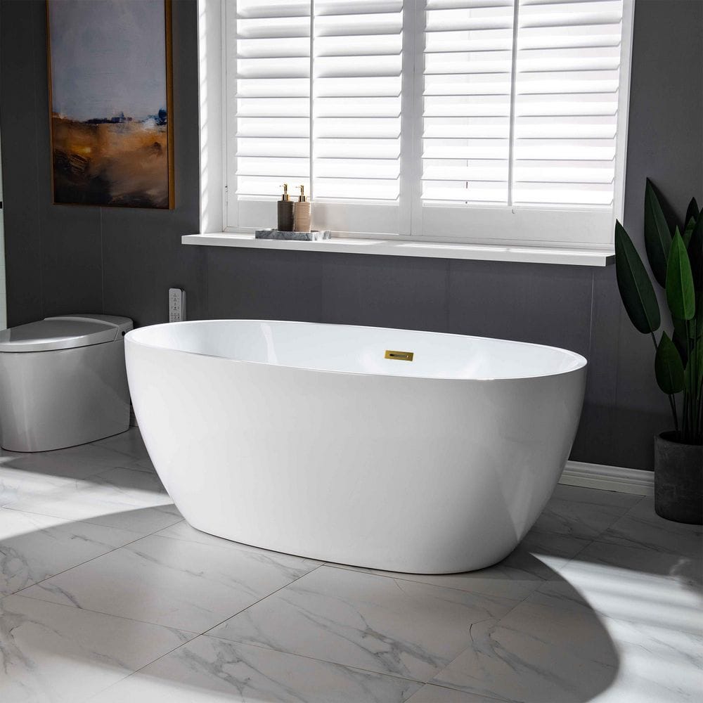A compact, double-ended freestanding tub crafted from high‑gloss acrylic for lasting durability and easy maintenance. Features an integrated overflow and matching drain with a non-slip bottom for safer soaking. Its oval silhouette and center drain maximize comfort in modern baths.