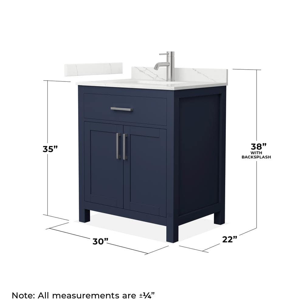 The Beckett 30" Freestanding Bath Vanity combines timeless design with practical functionality. Featuring a Giotto Quartz top and a dark blue cabinet with brushed nickel trim, it offers ample storage and a durable, water-resistant finish. Perfect for enhancing any bathroom space.