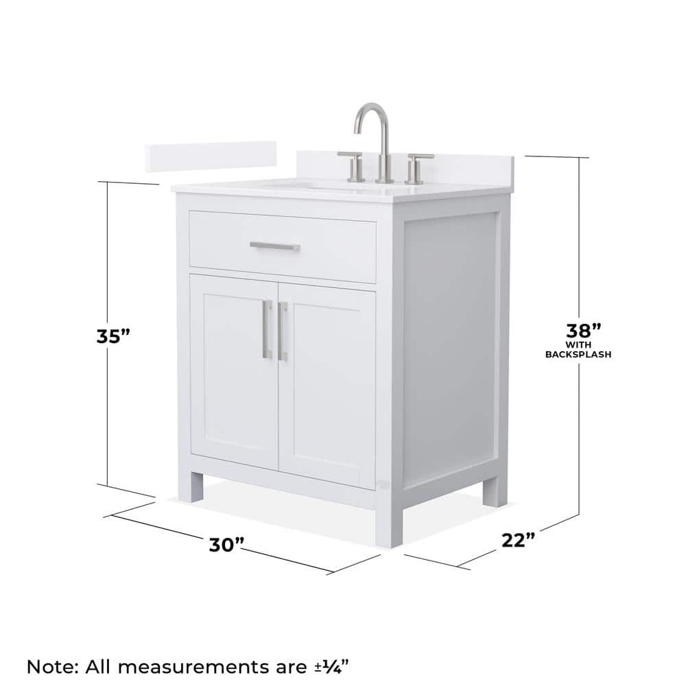 The Wyndham Collection Beckett 30" Freestanding White Bath Vanity combines timeless design with modern functionality. Featuring a durable white quartz top and soft-close doors, this vanity offers ample storage and a sleek look for any bathroom.