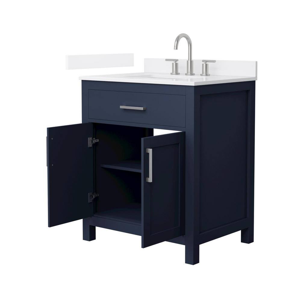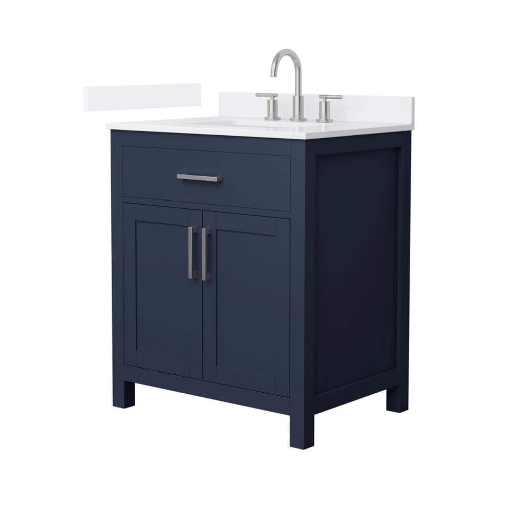 The Wyndham Collection Beckett 30 in. Freestanding Bath Vanity combines timeless design with modern functionality. Featuring a dark blue finish, white quartz top, and soft-close doors, it offers ample storage and a sophisticated look for any bathroom.