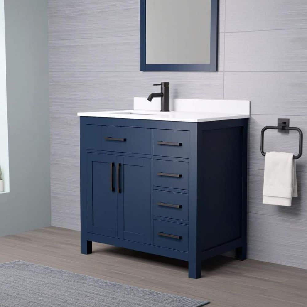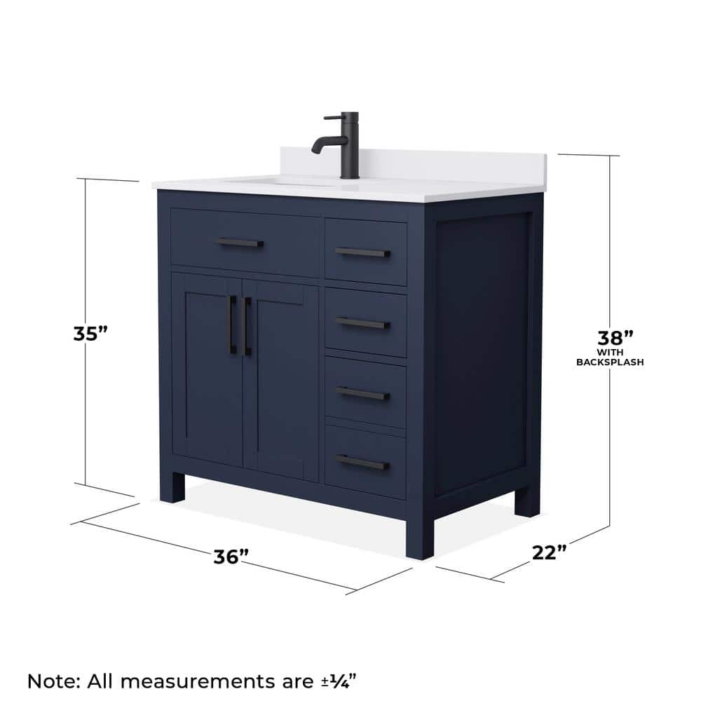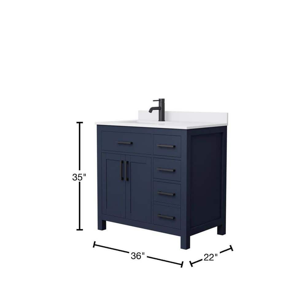 The Wyndham Collection Beckett 36" Bathroom Vanity combines timeless design with modern functionality. Featuring a dark blue finish, white cultured marble top, and ample storage, it enhances any bathroom space.
