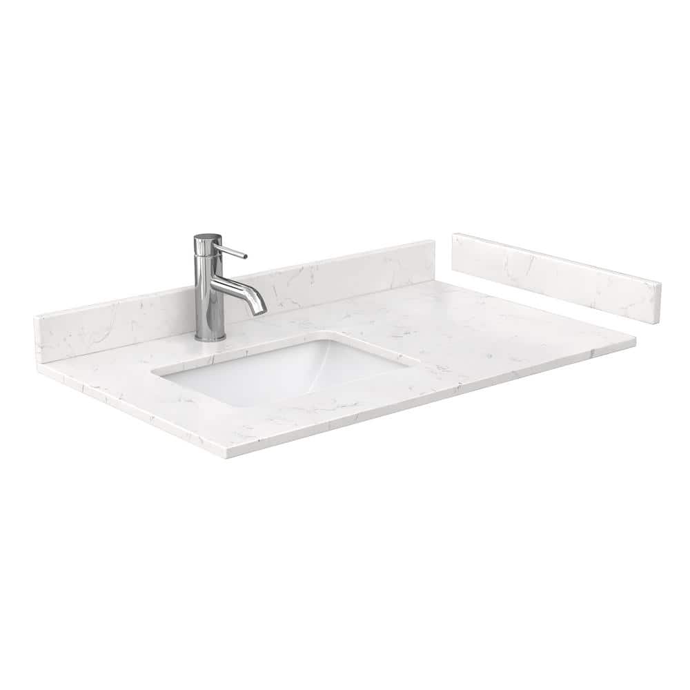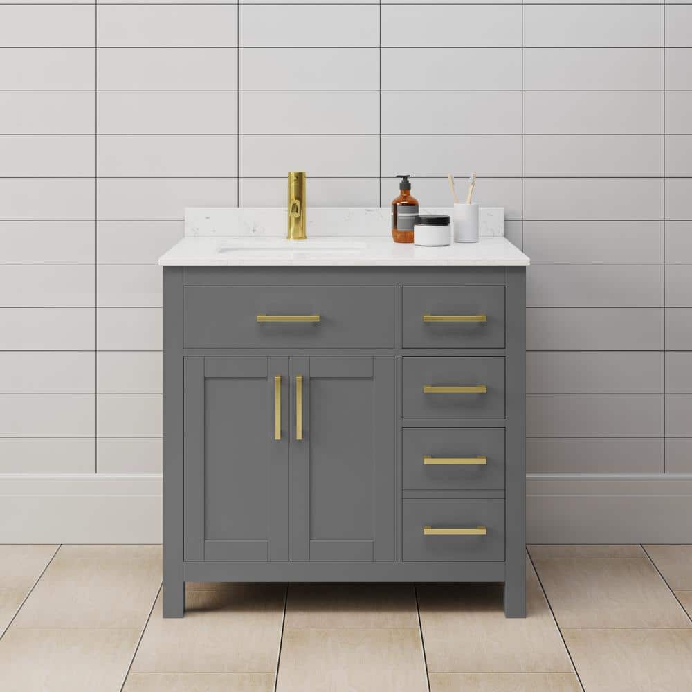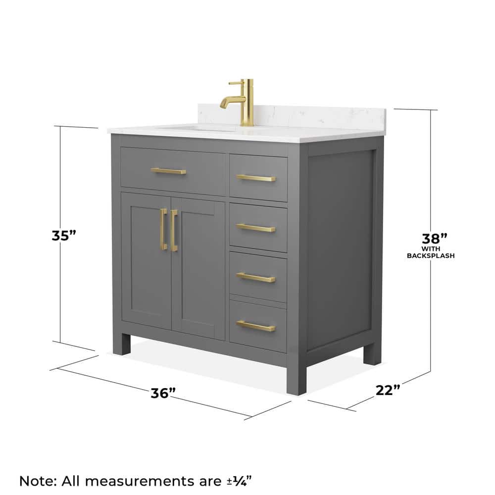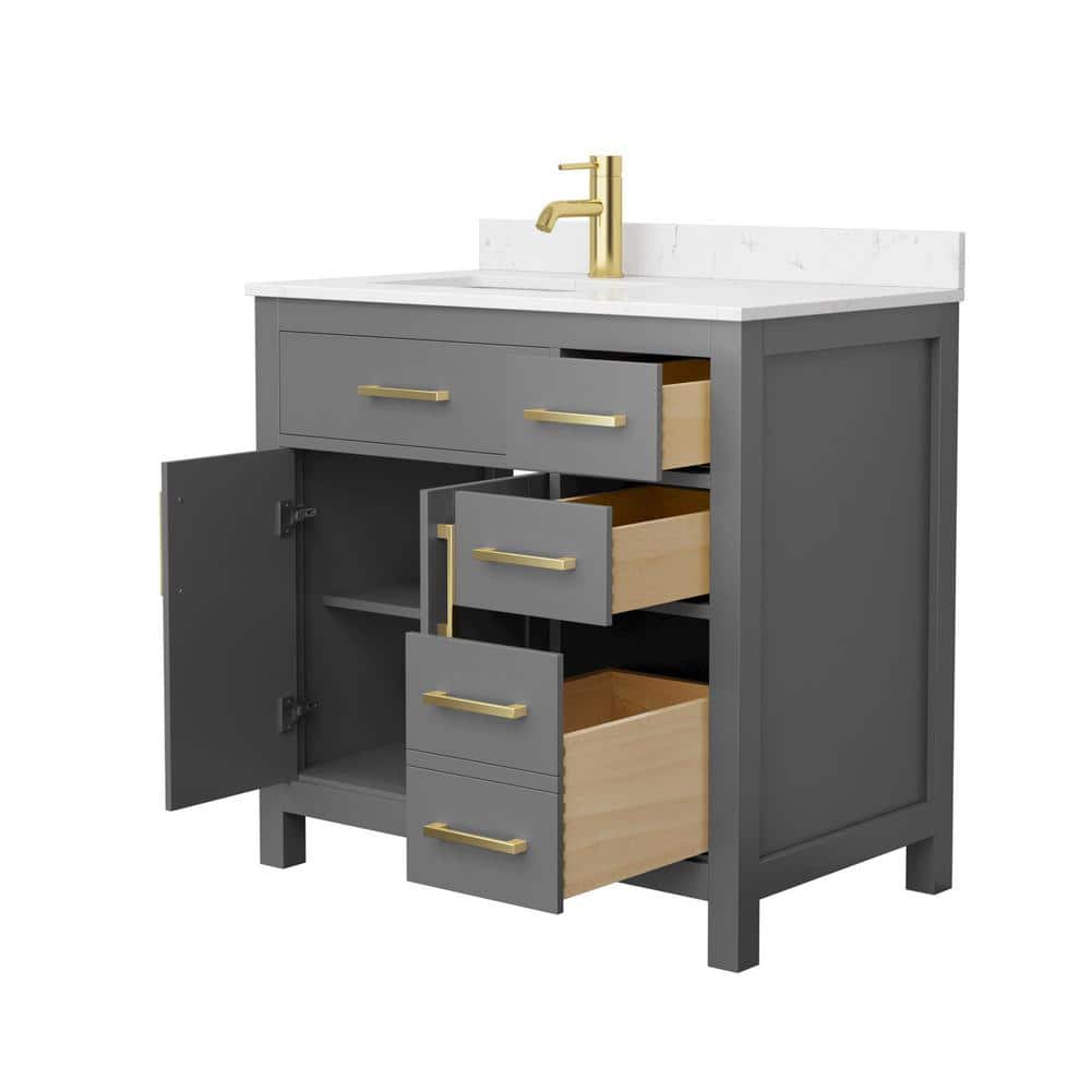 The Wyndham Collection Beckett 36" Bathroom Vanity combines timeless design with modern functionality. Featuring a Carrara cultured marble top and a dark gray finish, it offers ample storage with soft-close doors and drawers.