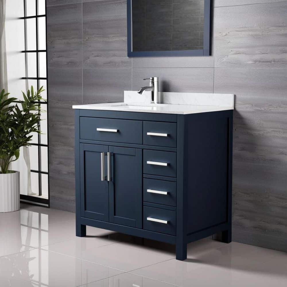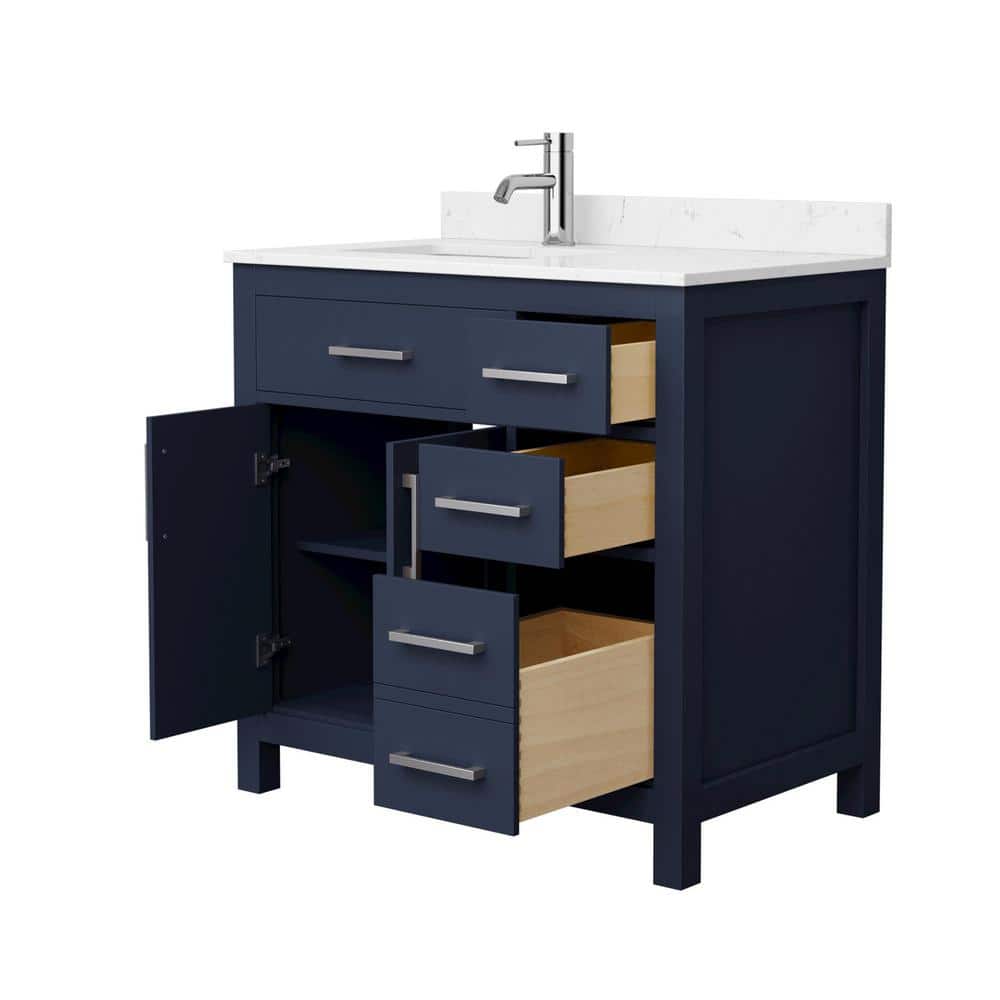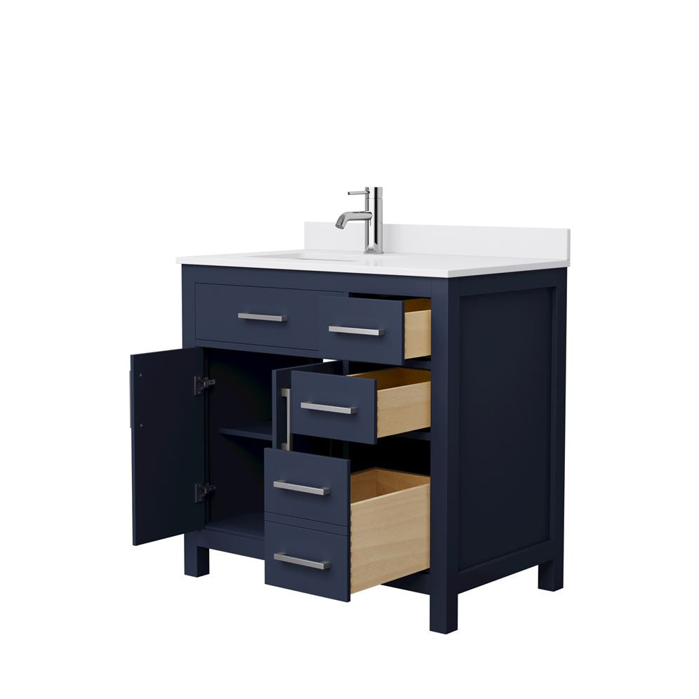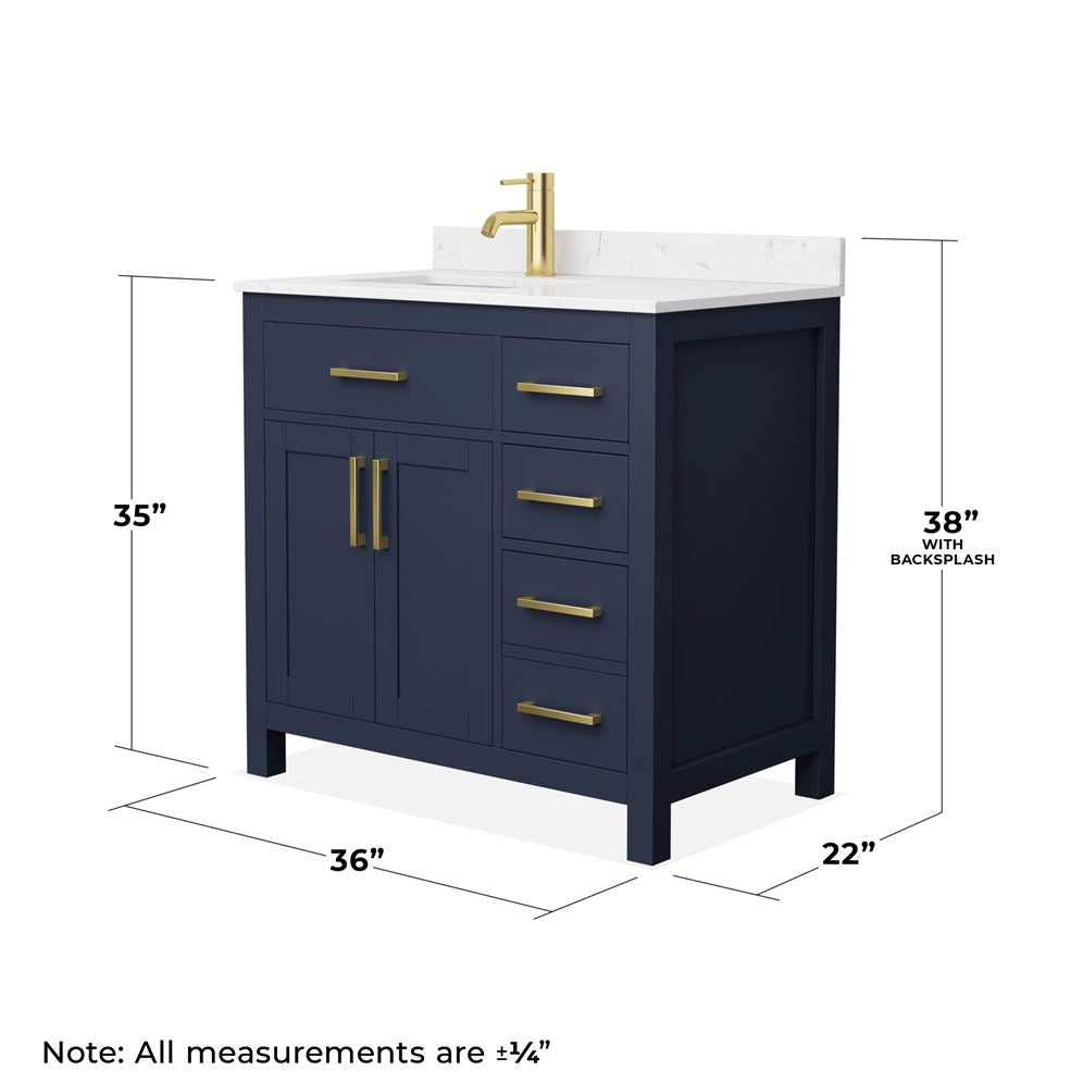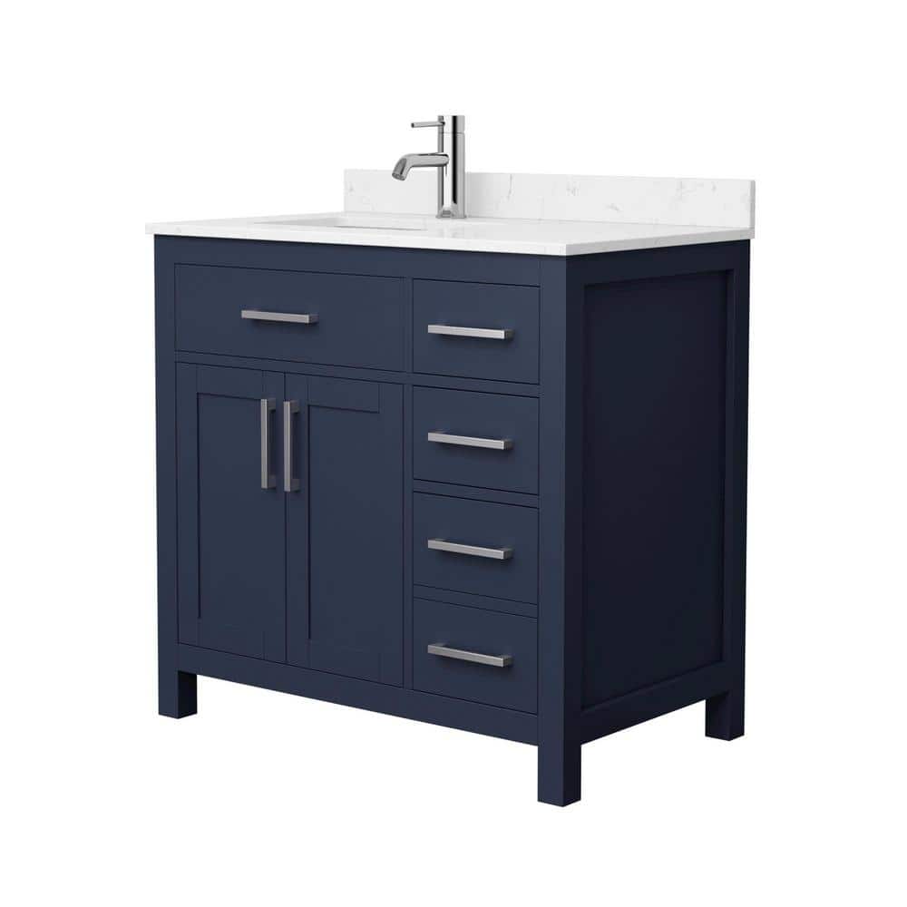 The Wyndham Collection Beckett 36" Bathroom Vanity combines timeless design with modern functionality. Featuring a dark blue finish, Carrara cultured marble top, and ample storage, it is perfect for any bathroom.