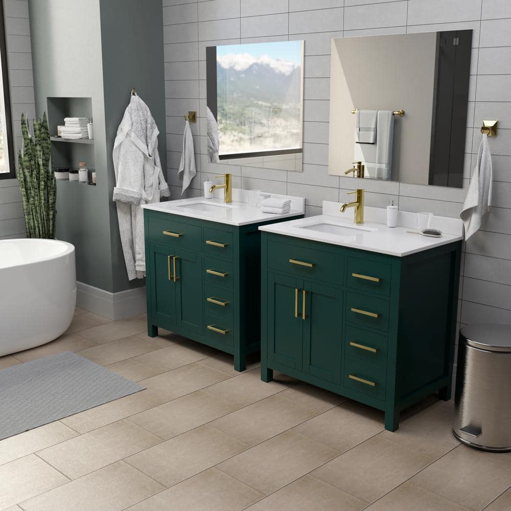 The Wyndham Collection Beckett Bathroom Vanity combines timeless design with modern functionality. Featuring a green wood cabinet with brushed gold trim and a Carrara cultured marble top, it offers ample storage and a luxurious aesthetic.