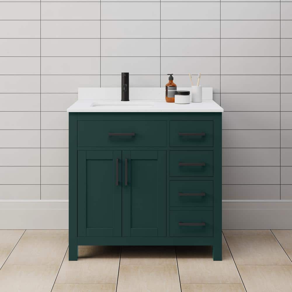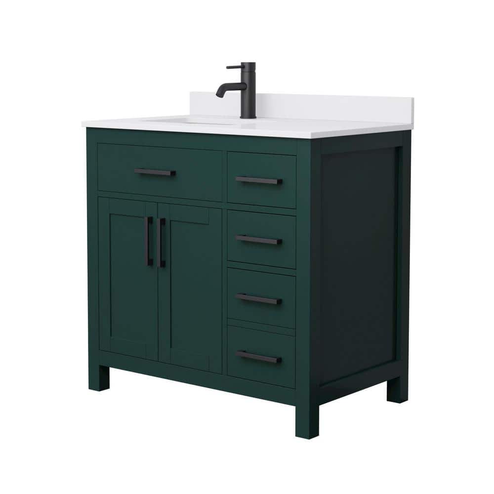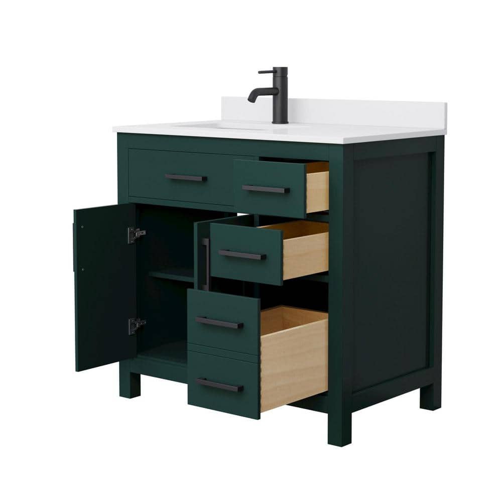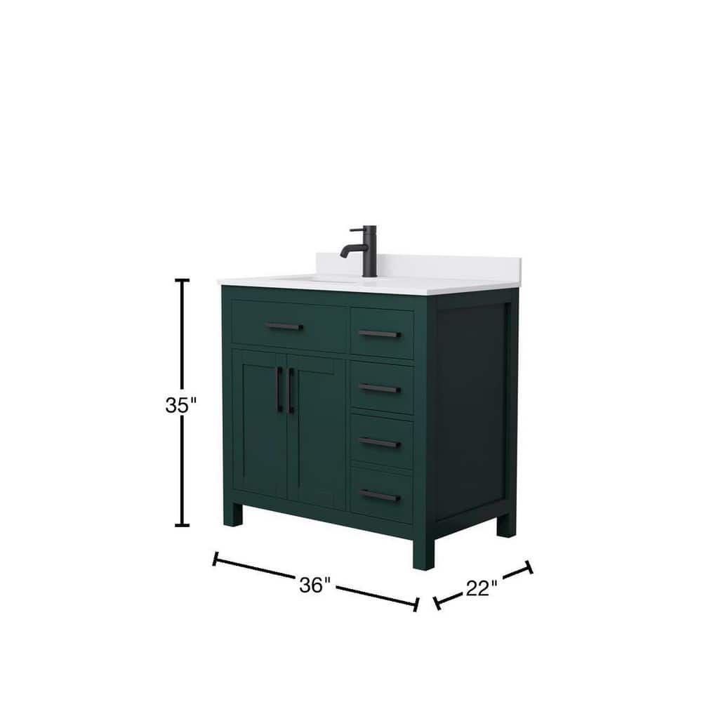 The Wyndham Collection Beckett 36" Bathroom Vanity combines timeless design with modern functionality. Featuring a green wood cabinet, white cultured marble top, and ample storage, it enhances any bathroom space.