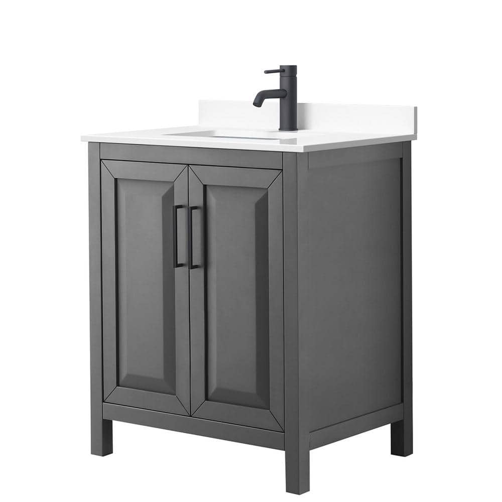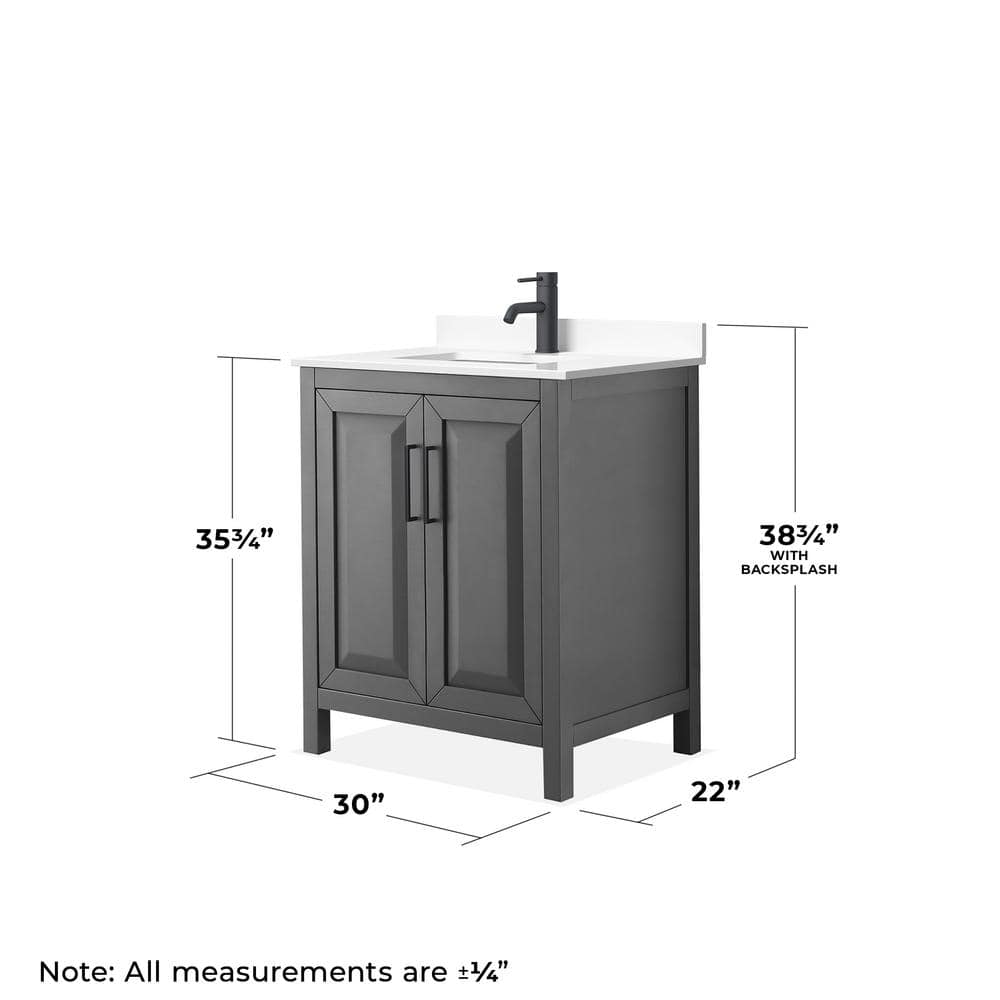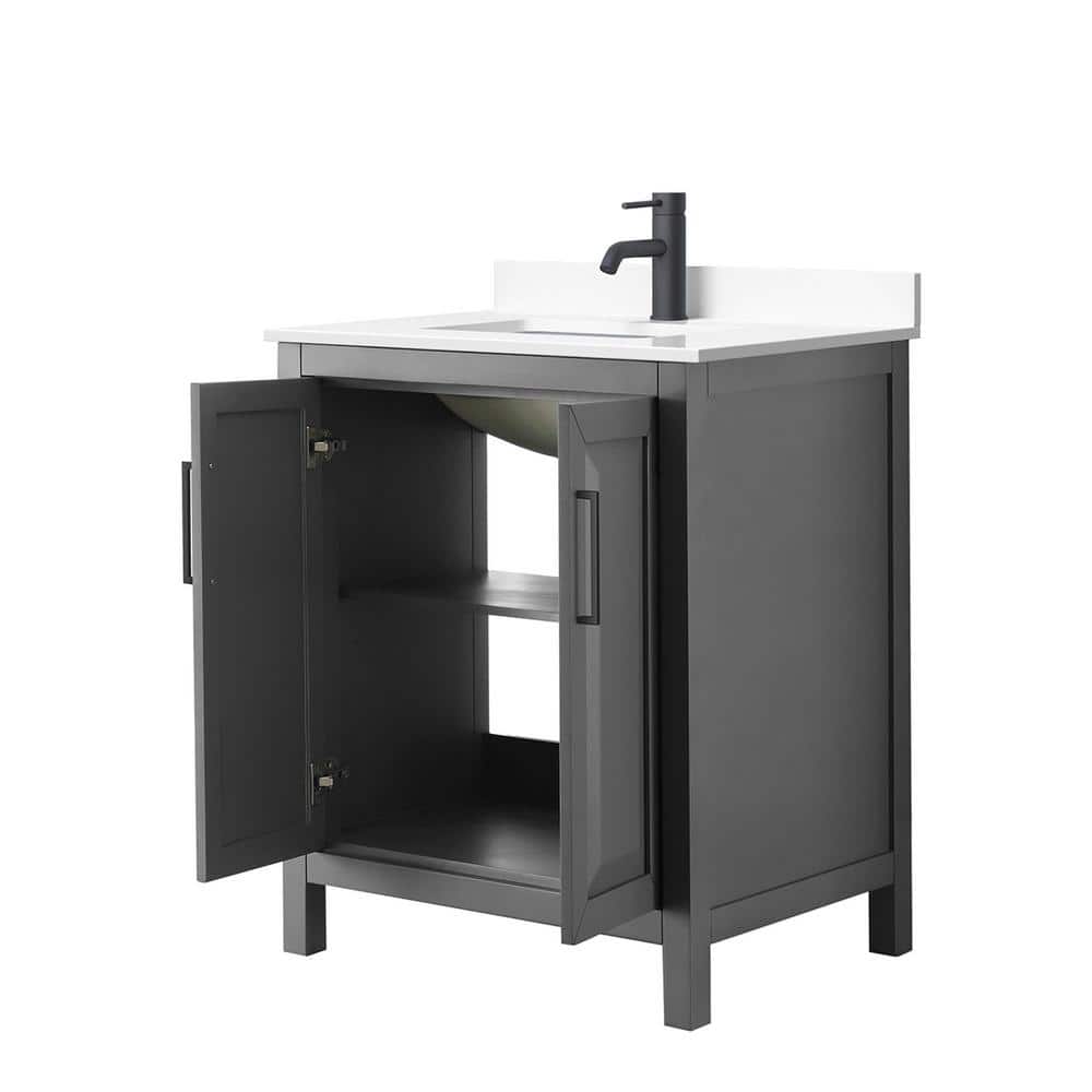 The Wyndham Collection Daria 30" Single Bath Vanity combines classic styling with modern functionality. Featuring a dark gray finish, white cultured marble top, and soft-close doors, this freestanding vanity is perfect for any bathroom.