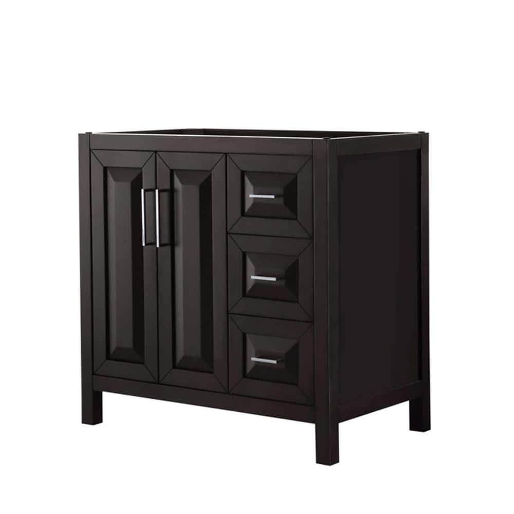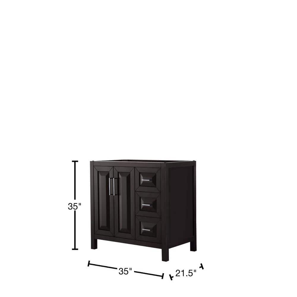 The Wyndham Collection Daria 35 in. Vanity Cabinet offers a blend of modern and classic design. Featuring a dark espresso finish, soft-close doors and drawers, and chrome hardware, it provides both style and functionality for your bathroom.