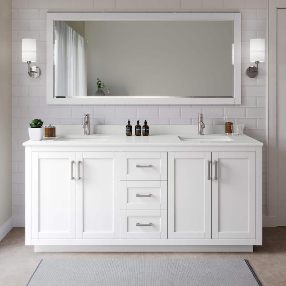 The Miranda Double Bath Vanity is a masterpiece of modern design, blending sleek lines with functional sophistication. Its white quartz countertop and brushed nickel accents create a serene and luxurious aesthetic. Style it with minimalist decor and soft lighting to enhance its contemporary charm. This vanity is not just a fixture; it's a statement of refined taste and practicality.