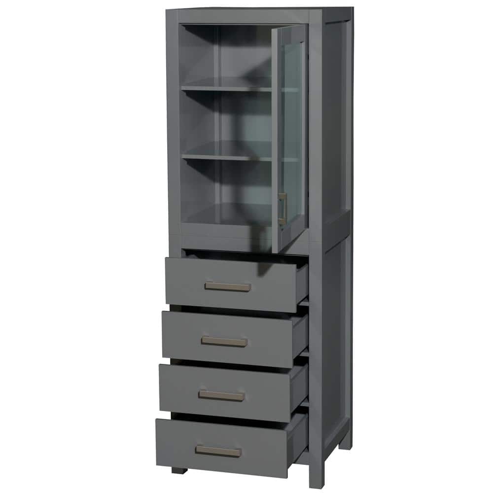 The Sheffield Linen Cabinet by Wyndham Collection offers a stylish and practical storage solution for your bathroom. With its dark gray finish, brushed chrome trim, and soft-close features, this cabinet combines elegance with functionality.