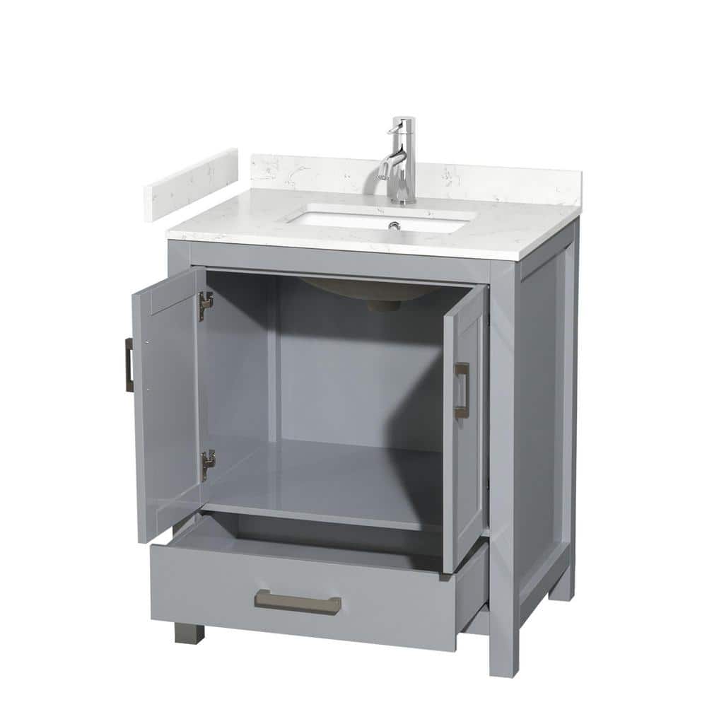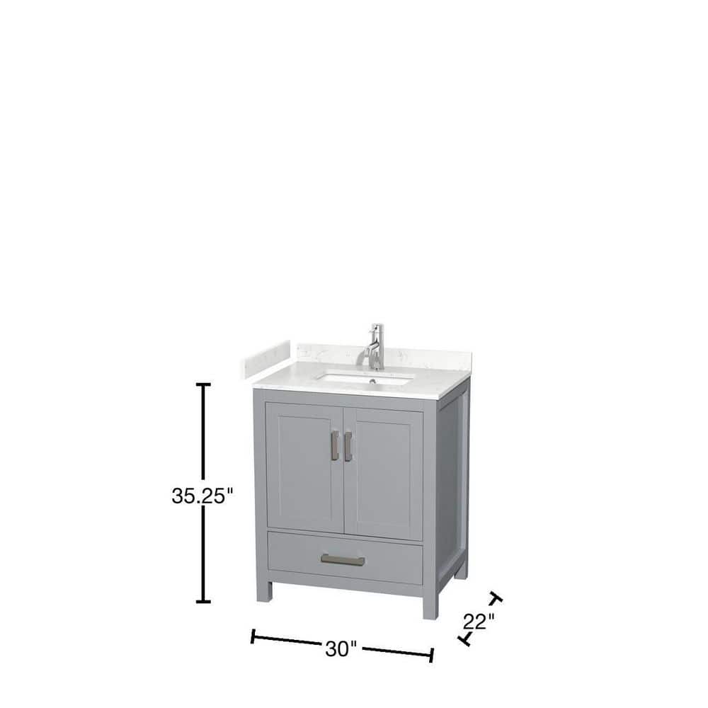 The Sheffield 30-inch bathroom vanity by Wyndham Collection combines timeless design with modern functionality. Featuring a Carrara cultured marble top and a sturdy wood cabinet in gray, it offers ample storage and a sleek, transitional style.