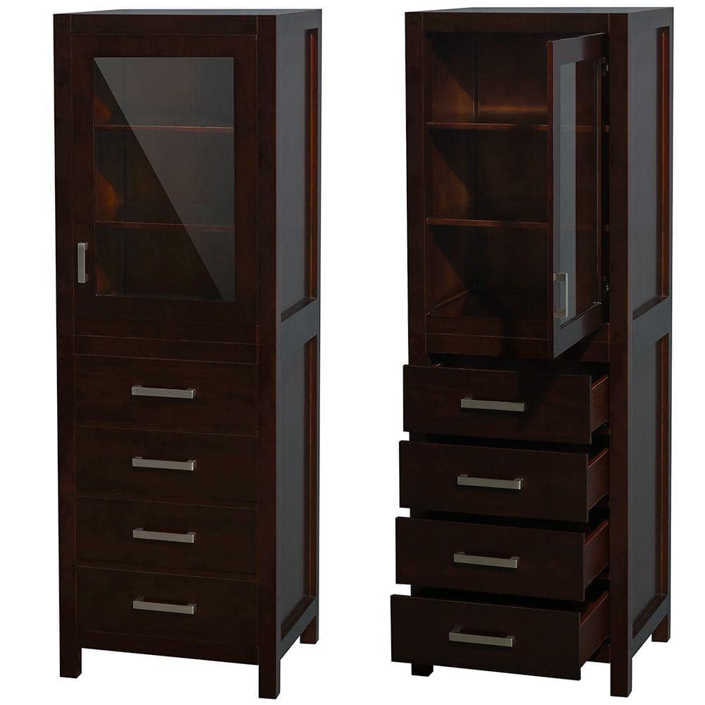 The Sheffield Bathroom Linen Storage Tower by Wyndham Collection combines elegant design with practical storage. Featuring a freestanding design, it includes a glass-paneled door, four drawers, and three shelves, all in a rich espresso finish.