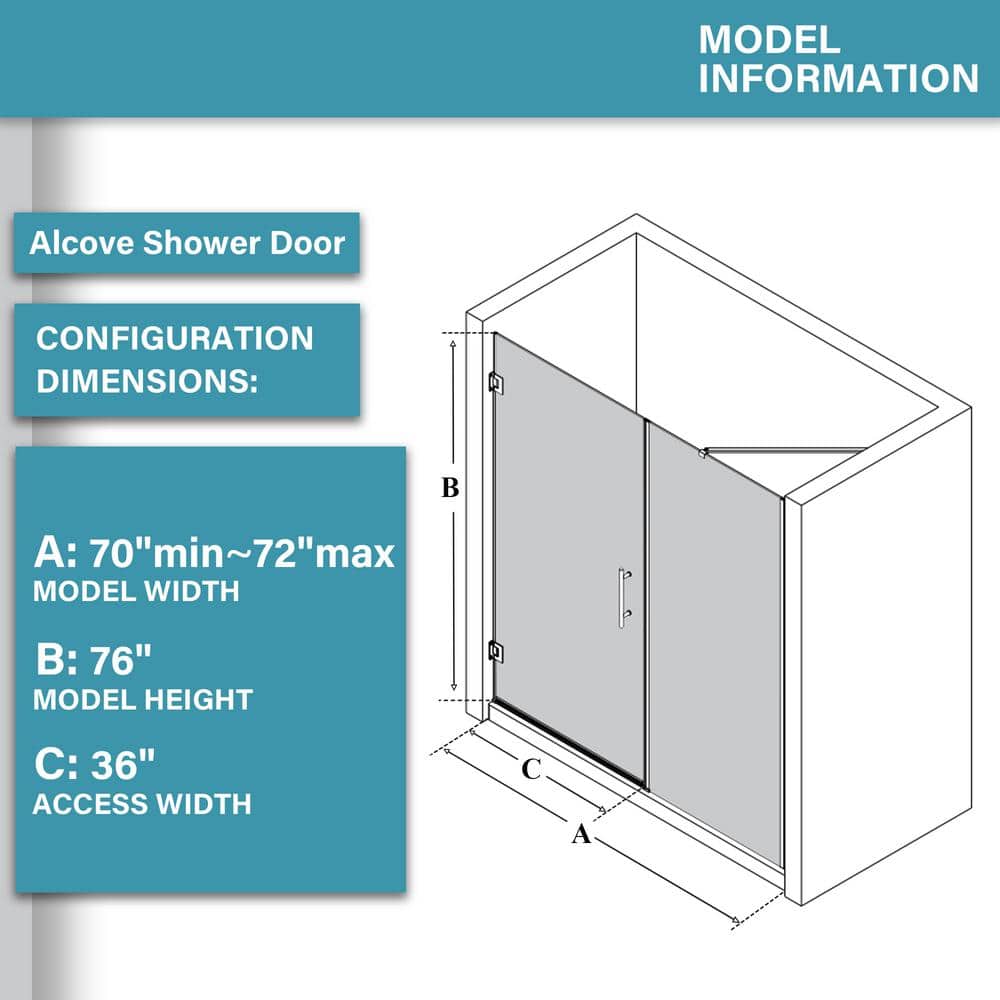 Q: Will this door fit in my space? A: This shower door is designed to fit an installation width of 70 to 72 inches, accommodating most alcove setups.