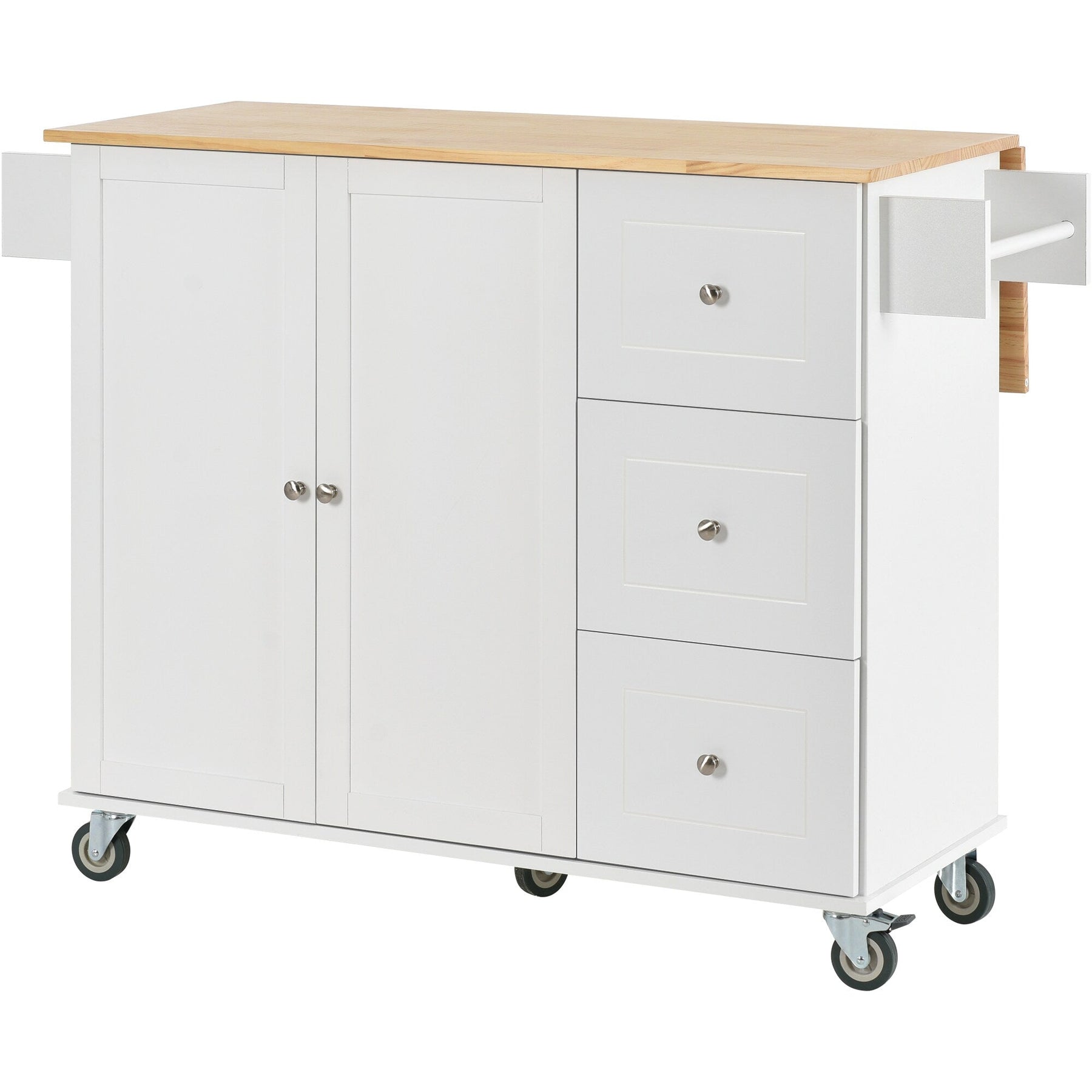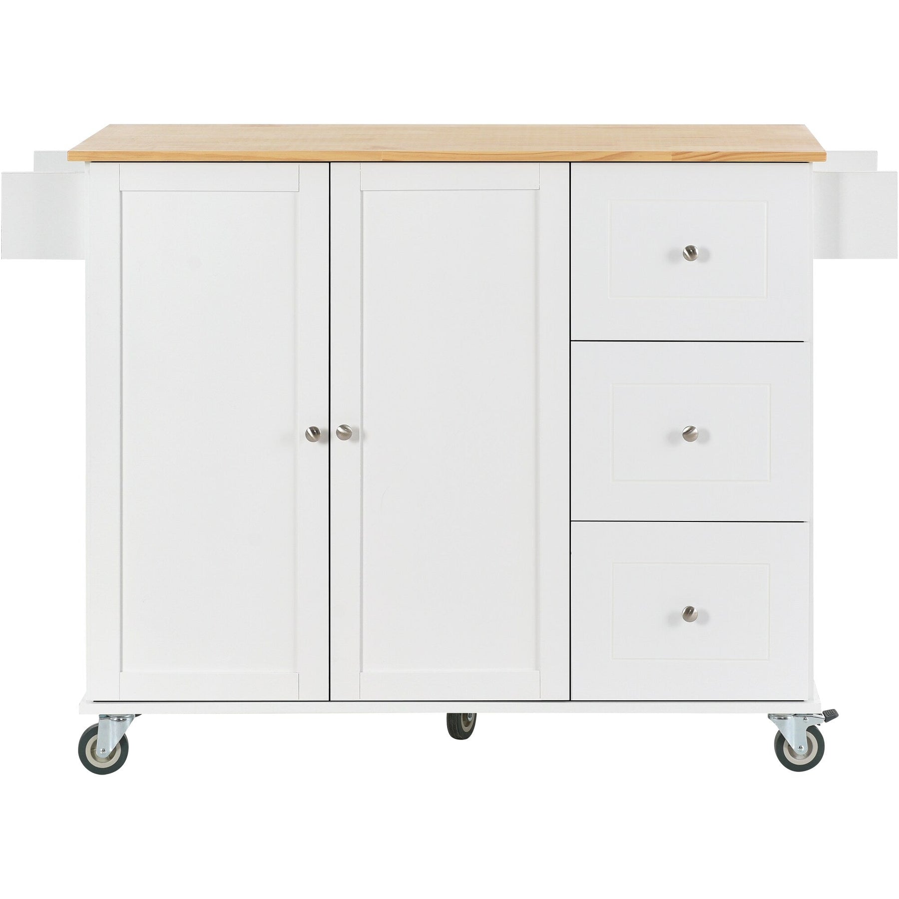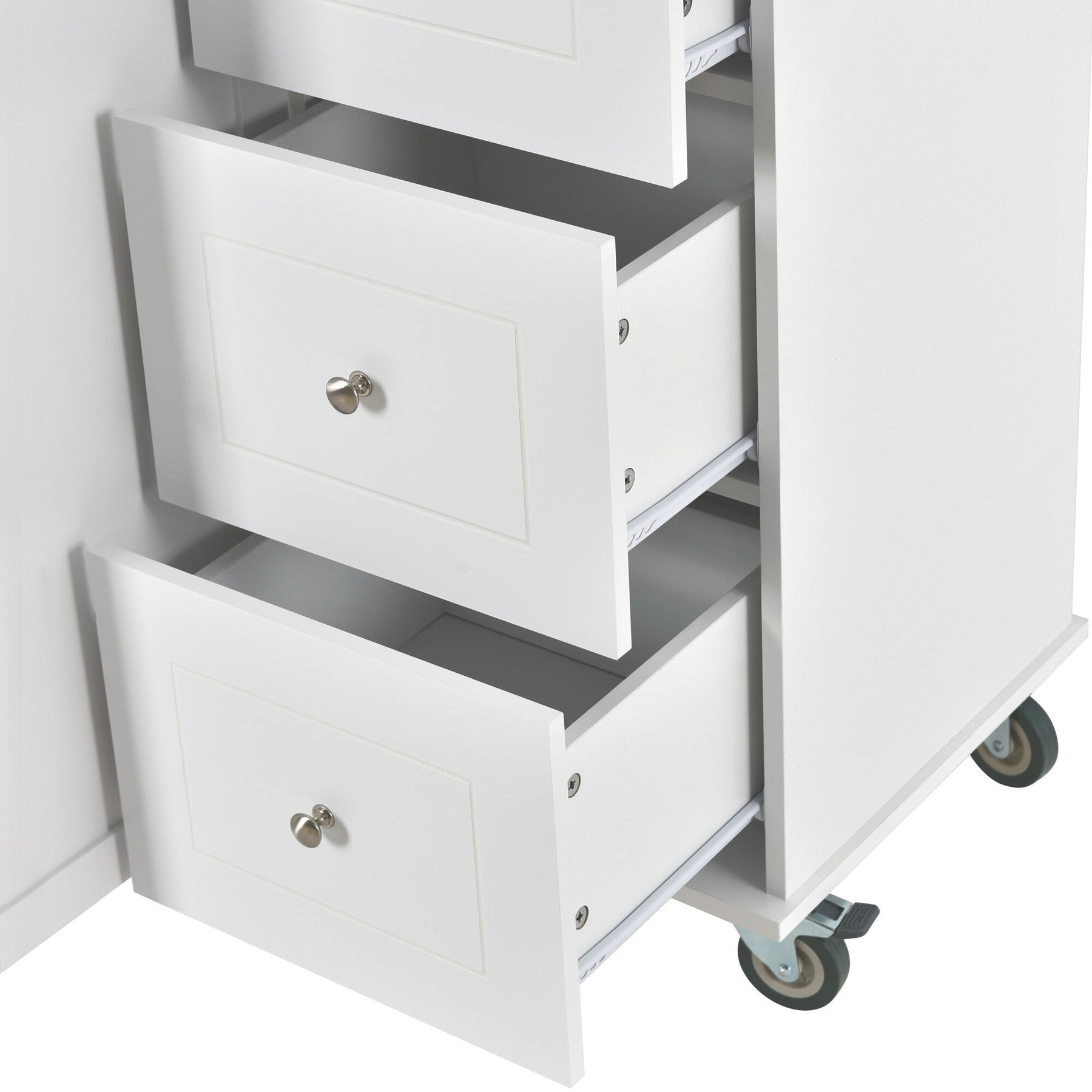 This white MDF base kitchen island combines functionality and style with its rolling design and solid wood top, offering a dynamic solution for modern kitchens. Featuring a drop leaf breakfast bar and versatile storage, this island is perfect for both professional chefs and home cooks seeking convenience and efficiency.