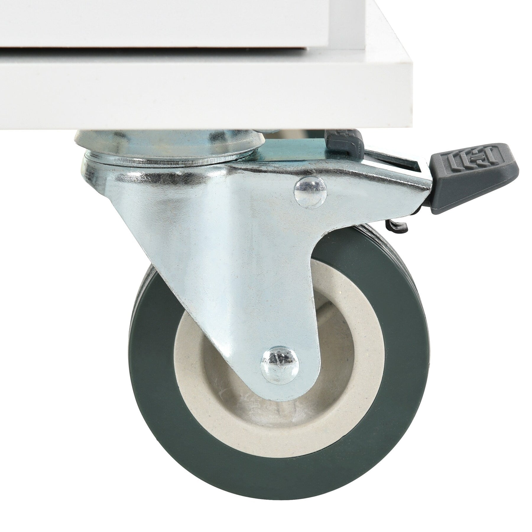 Q: Can I lock the wheels of the kitchen island? A: Yes, two of the wheels are equipped with locking mechanisms to provide stability when the island is in use.