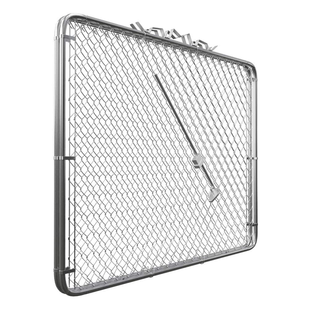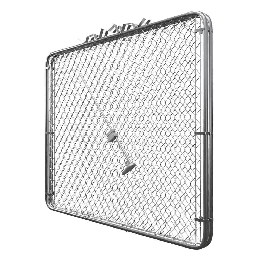 A: The frame is built from 20-gauge, 1-3/8 in. galvanized steel tubing and the gate-fill is composed of 11.5-gauge chain link fabric, making it both sturdy and rust-resistant.