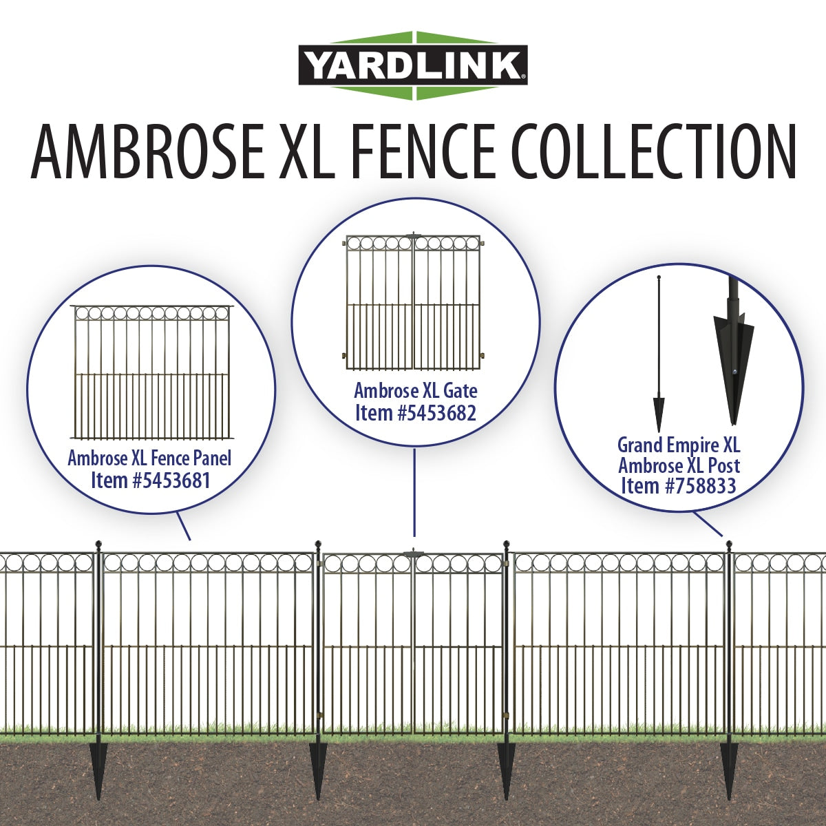 The YARDLINK Grand Ambrose XL Decorative Fence Gate combines elegance and practicality for your outdoor spaces. Crafted from black powder-coated steel, it offers a durable, rust-resistant finish with no-dig installation for ease and convenience, making it ideal for yard fencing or garden perimeters.