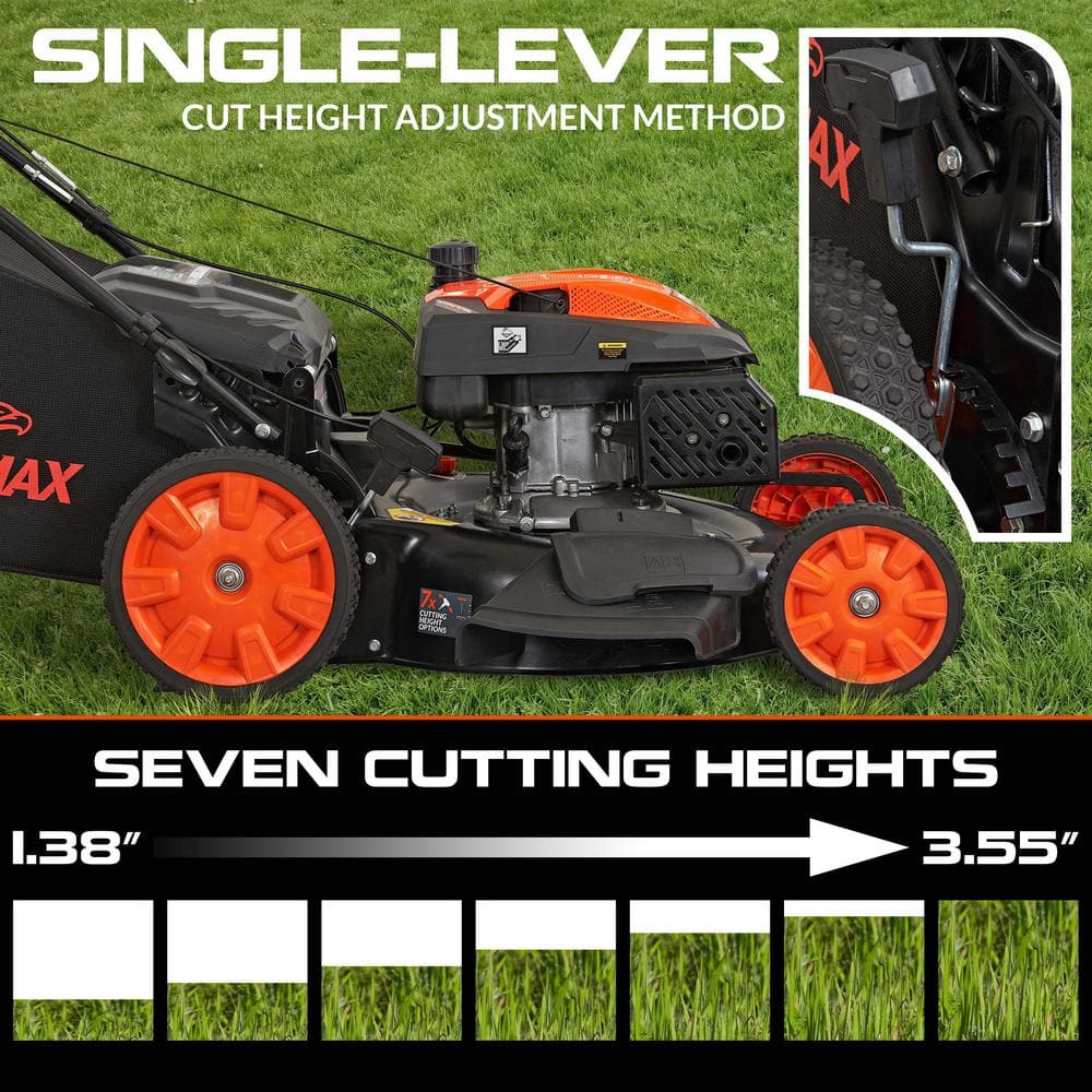 Q: What cutting height options are available? A: There are seven cutting height options, ranging from 1.38 inches to 3.55 inches, which can be adjusted via a single lever.