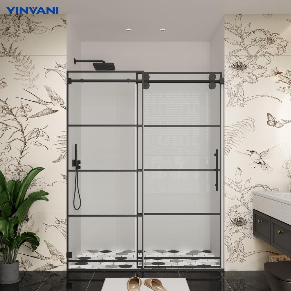 YINVANI 60 in. W x 76 in. H Single Sliding Frameless Shower Door in Matte Black with Easy-Clean 3/8 in. Black Grids Glass