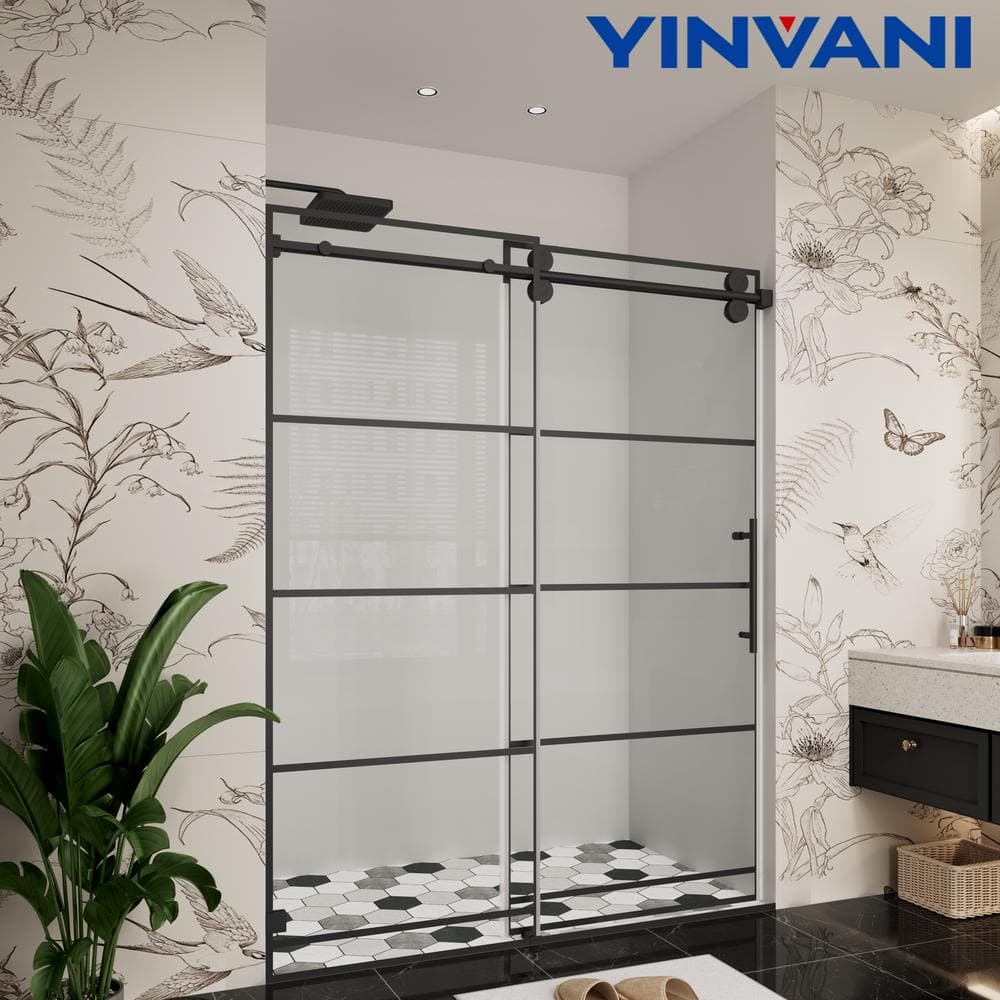 Transform your bathroom with the sophistication of the YINVANI frameless sliding shower door. Finished in a chic matte black, this door features premium tempered glass with black grid design, offering both style and strength. Its easy-clean technology ensures a lasting shine with minimal maintenance, perfect for busy professionals and home renovators alike.