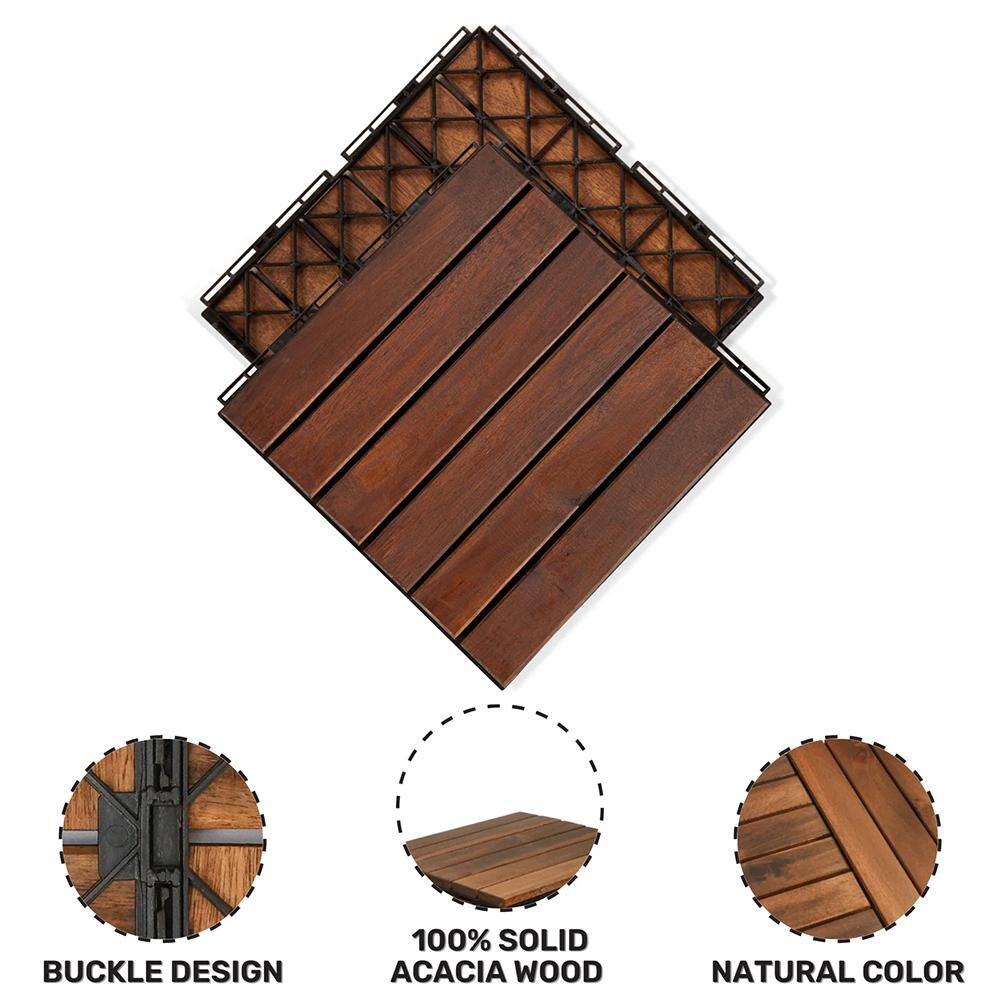 Introducing YOFE's Acacia Wood Interlocking Deck Tiles, expertly designed to transform any space into a refined, natural setting. Crafted from dense, durable acacia wood, these tiles are perfect for both indoor and outdoor applications, offering a rich striped pattern that beautifully complements any environment. With their intuitive interlocking mechanism, these tiles offer a hassle-free installation experience, making them ideal for DIY enthusiasts and professional installers alike.