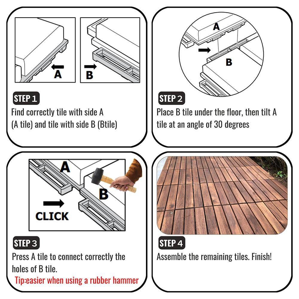 Q: How easy is it to install these deck tiles? A: The interlocking design allows for quick and simple installation without the need for professional tools. A rubber hammer is recommended to secure the tiles snugly.