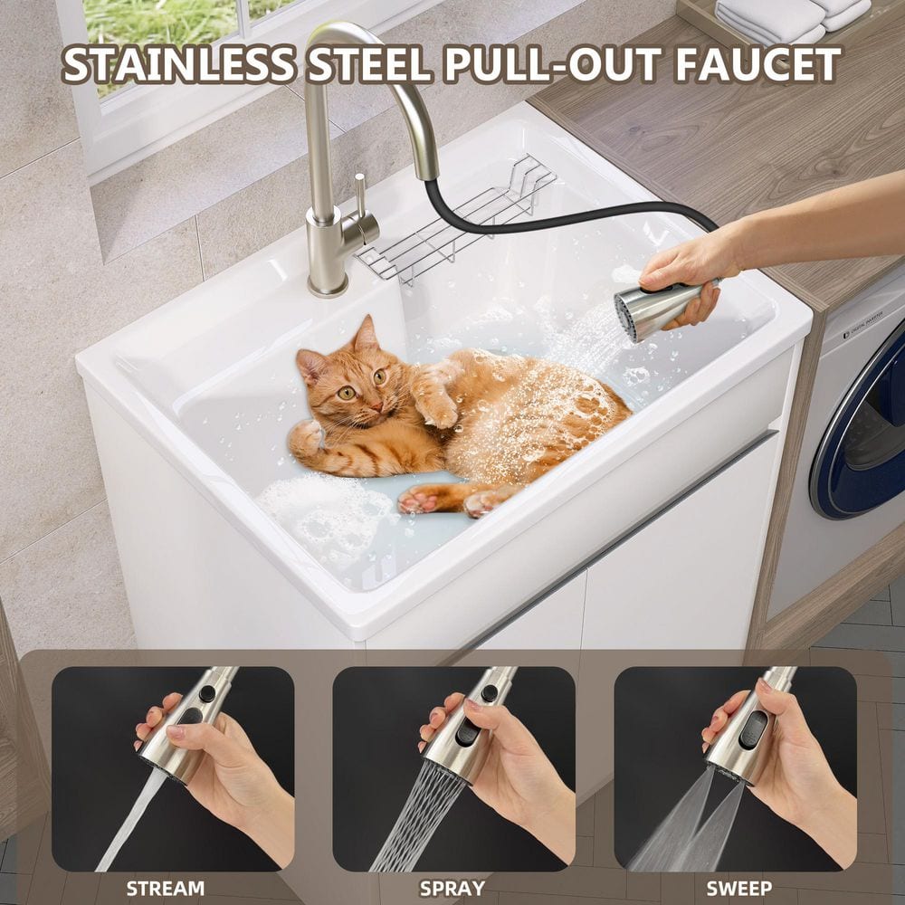 The Zeafive All-in-One Laundry Sink is your ultimate solution for efficient home utility spaces. Featuring a durable solid surface sink paired with a sleek white cabinet, this unit offers a perfect blend of functionality and style. Equipped with a multi-function faucet, this set is designed to tackle any task from washing clothes to cleaning tools with ease.
