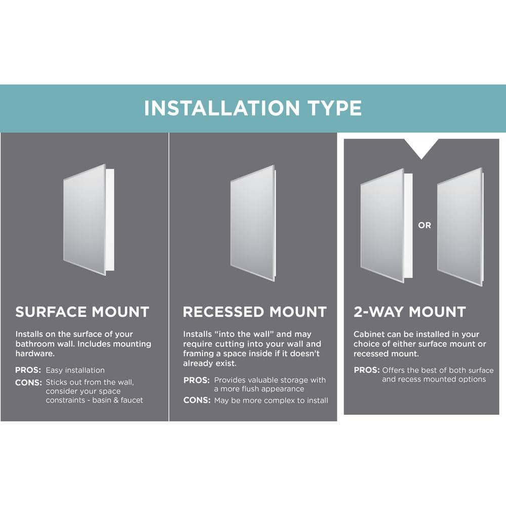Q: How is the medicine cabinet installed? A: The cabinet can be installed as either recessed or surface mount, providing flexibility for different spaces and preferences.