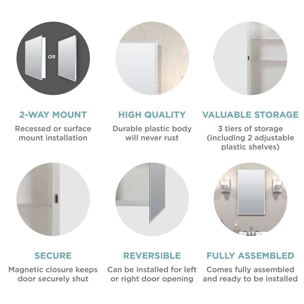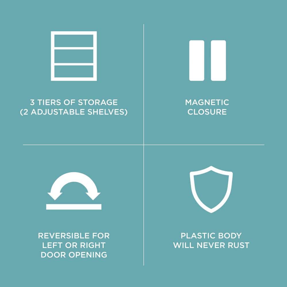 Q: Is the cabinet resistant to rust? A: Yes, the cabinet has a durable plastic body that is designed to resist rust and corrosion, ideal for bathroom environments.